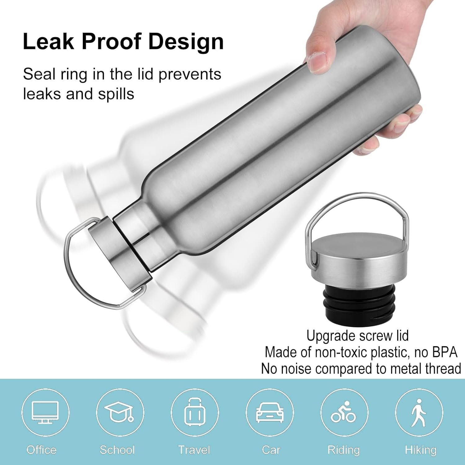 The sports water bottle consists of 304 stainless steel, which can drink directly whether it be hiking, cycling, camping, gym or just to the office, durable and leak proof.
