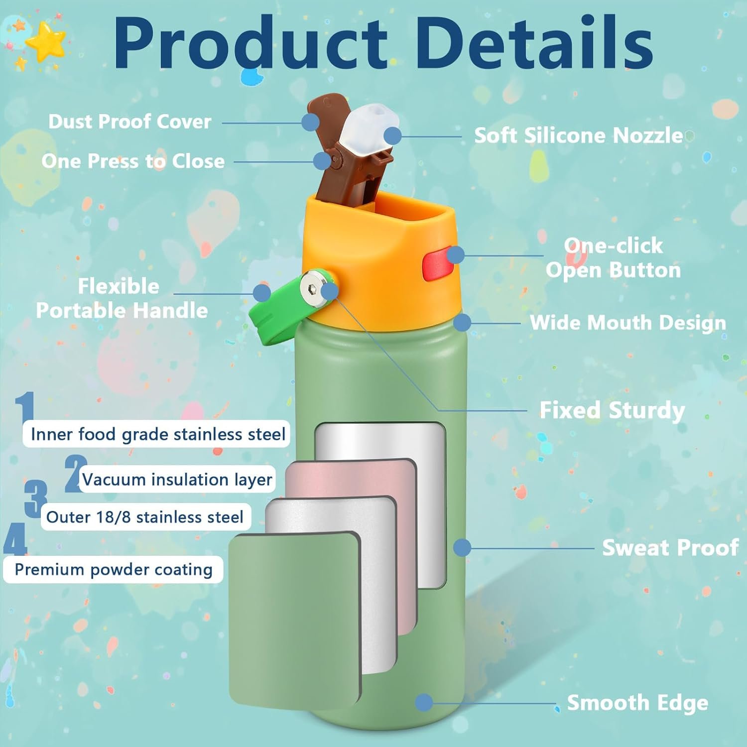Every Detail Gently Designed for Your Child: This 18 oz kids’ water bottle is made from BPA-free materials and features a dust-proof square cap to keep the nozzle clean. The food-grade soft silicone spout ensures gentle sipping. With its convenient one-touch open-and-close mechanism, the lid is both easy and hygienic to use. The sturdy rotating handle provides a secure and comfortable grip, making it easy for little hands to carry.