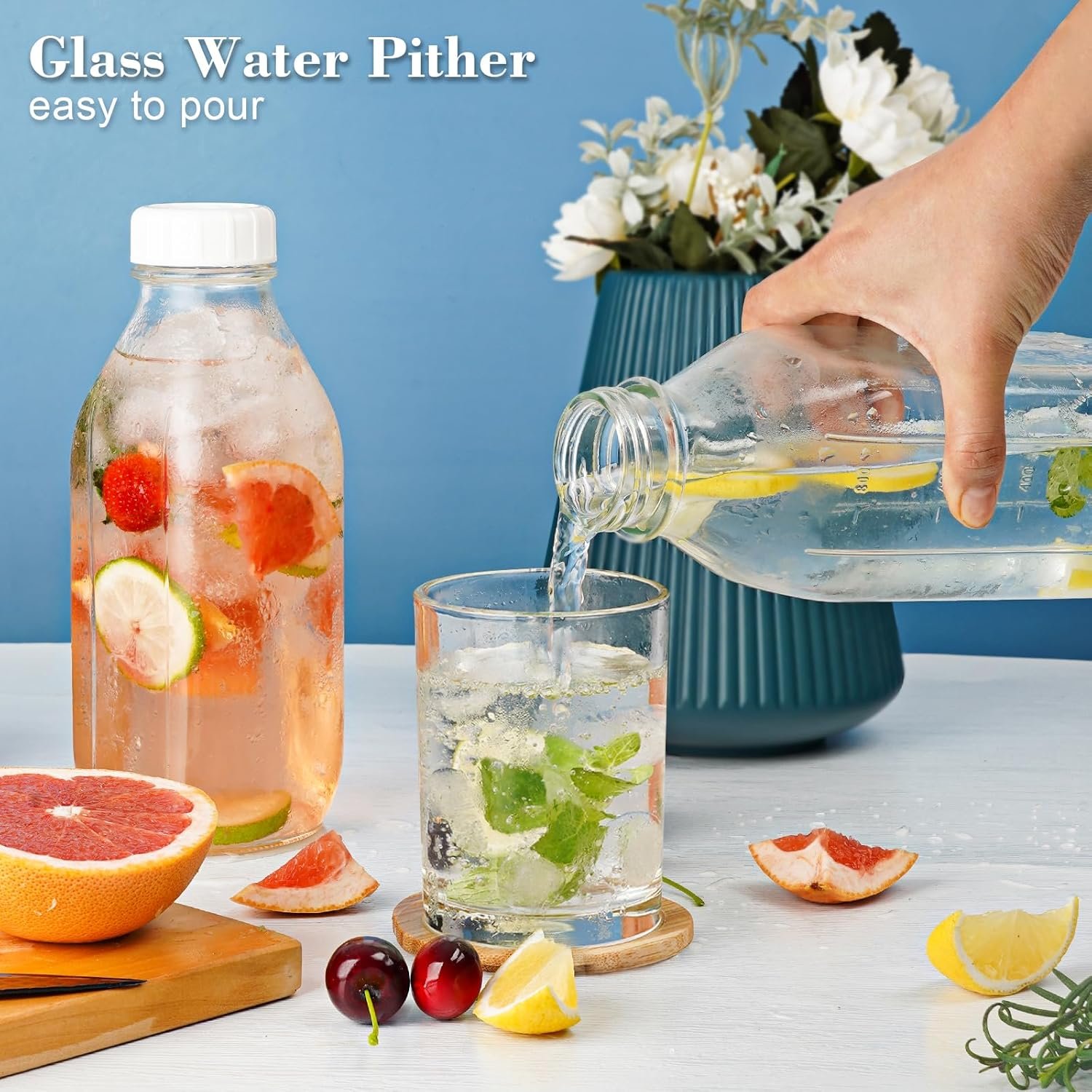 With Scale Mark:Each glass milk jug comes with two scales: milliliters and fluid ounce, the glass pitcher has a capacity of 1L/33.8 fl oz, great for measuring how much juice and water you are drinking at any time to monitor your water intake and enhance health management.