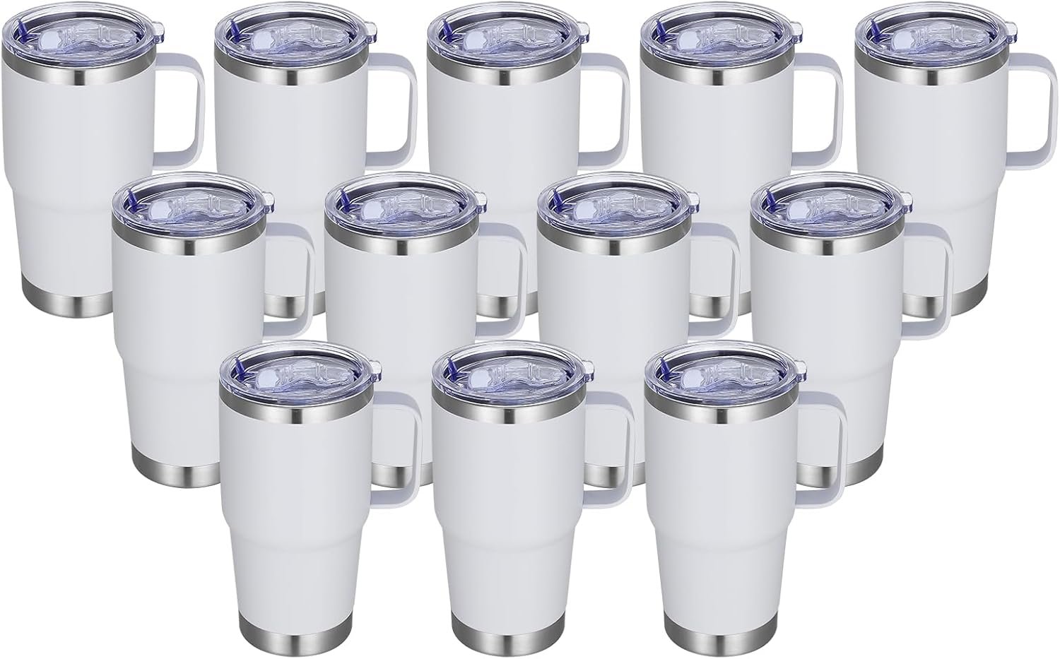 20 oz Stainless Steel Tumbler with Handle Bulk Metal Insulated Tumblers Travel Coffee Mug with Handle Double Wall Tumbler Cup with Lid and Straw, White 12 Pack