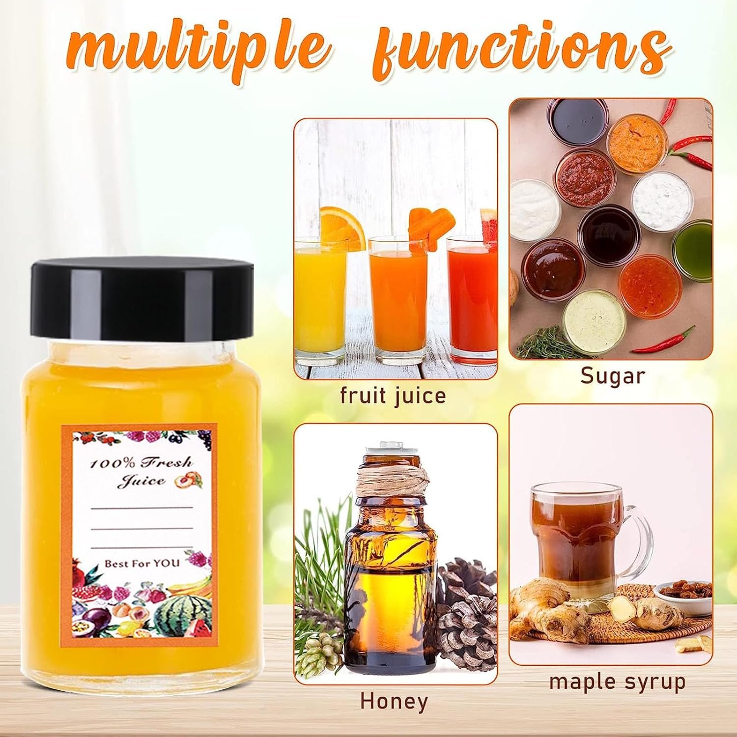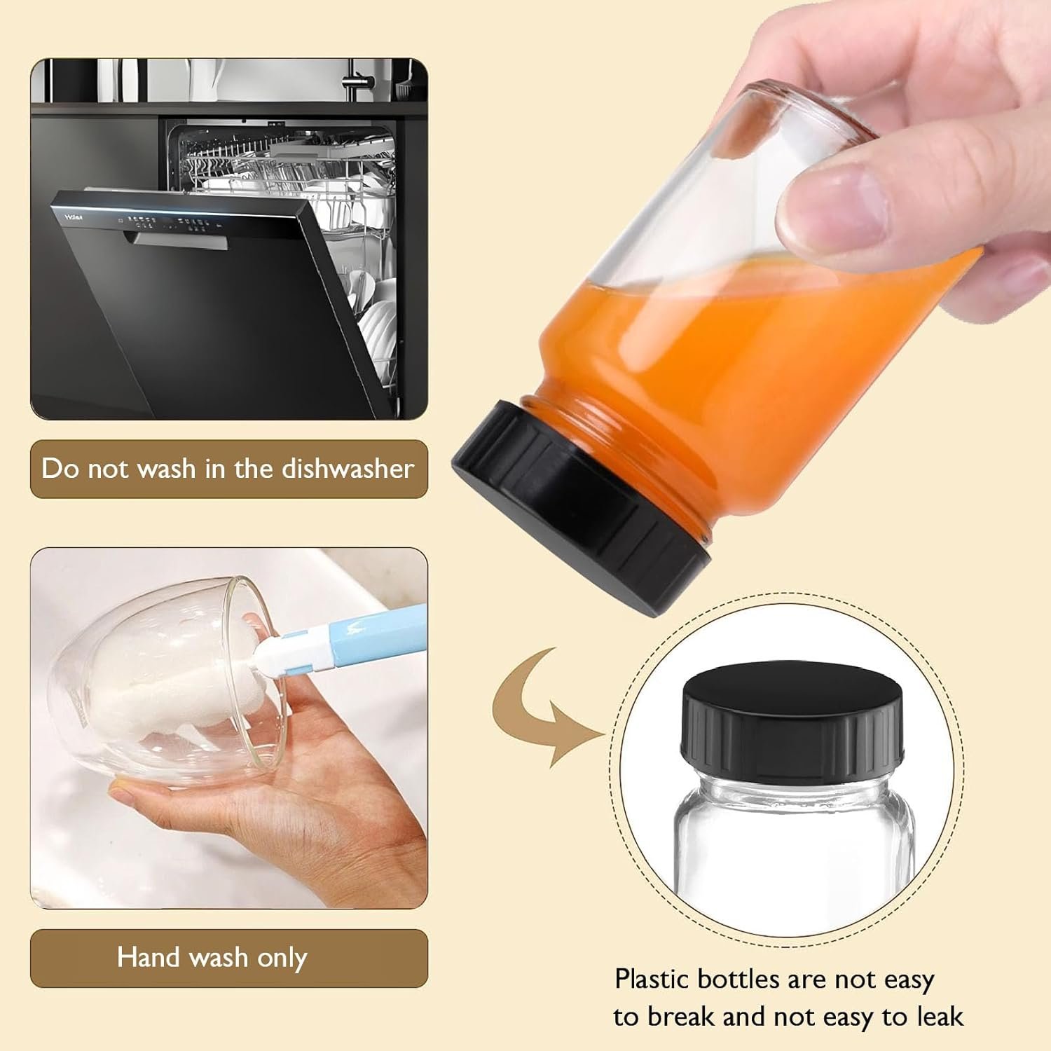 Leakproof Design: Juice shot bottles with caps inner foam liners and screw-top lids create a tight seal.Temperature Resistant: Small bottles for liquids safe for hot broths, frozen smoothies, or room-temperature syrups.Easy Cleanup: Dishwasher-safe glass + hand-wash lids for sparkling results every time. More Than Just Bottles – A Complete Solution
