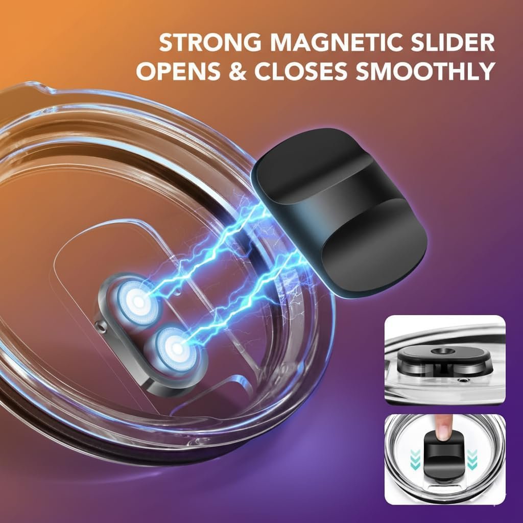 STRONG MAGNETIC SLIDER: Removable magnetic cover locks securely onto the lid, keeping splashes at bay. Slides easily for one-handed sipping; includes a straw-friendly opening.
