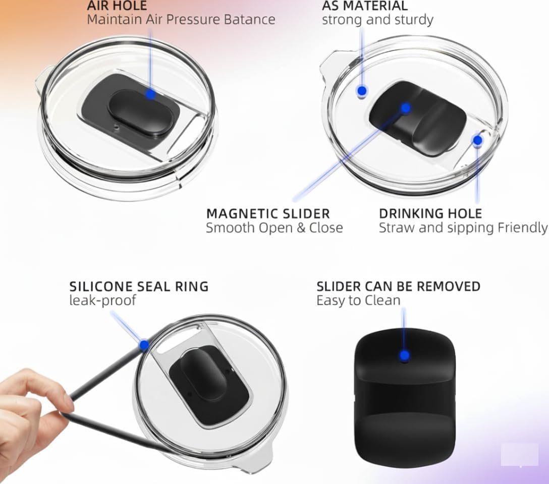 It’s especially useful when drinking from a tumbler or rambler. No more scalding worries.The magnetic slider switch can be opened and closed to allow direct drinking or the use of a regular straw.Have one of these lids in your car to prevent accidental seat damage.Magnetic SliderBPA FreeDishwasher SafeSpill ProofCrystal Clear
