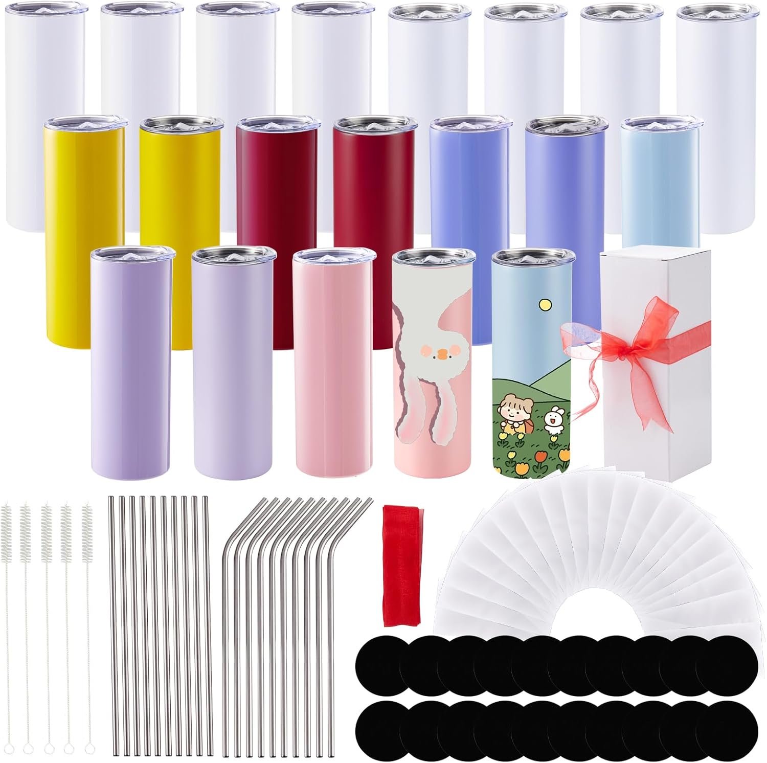20pcs 20oz Sublimation Tumblers with Lids and Straws, Multi Color Stainless Steel Skinny Tumbler Sublimation Blanks Slim Insulated Cups for Heat Press with Shrink Wrap Water Bottles for Iced Coffee