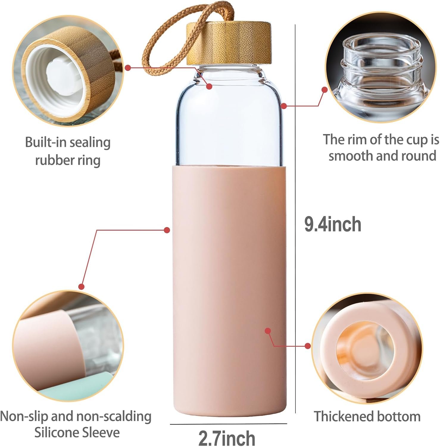 Leak-proof Design: The glass water bottles with Leak-Proof Bamboo Lid. The lid is Sealed and leak-proof, so you can confidently throw the bottle into your gym bag, briefcase, or travel backpack without worrying about spills.