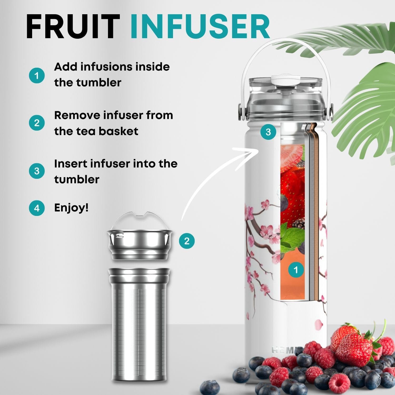 The tea bottle comes with a stainless steel infuser that will work for all types of tea. The stainless steel mesh strainer sits perfectly inside the travel mug and makes steeping your tea a breeze. Add fruit to your bottle, fill with water, and unscrew the basket and use the section attached to the handle as a strainer to turn your bottle into a fruit infuser.