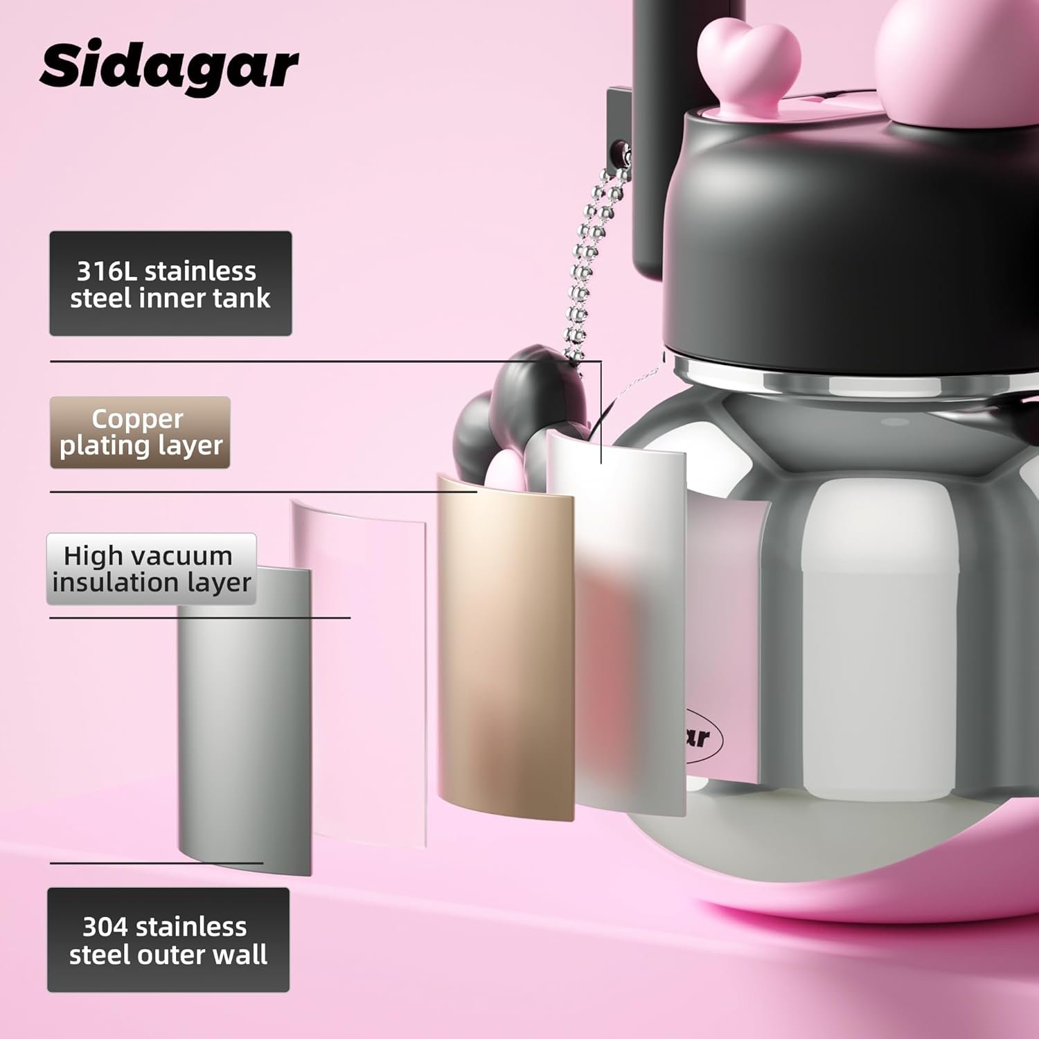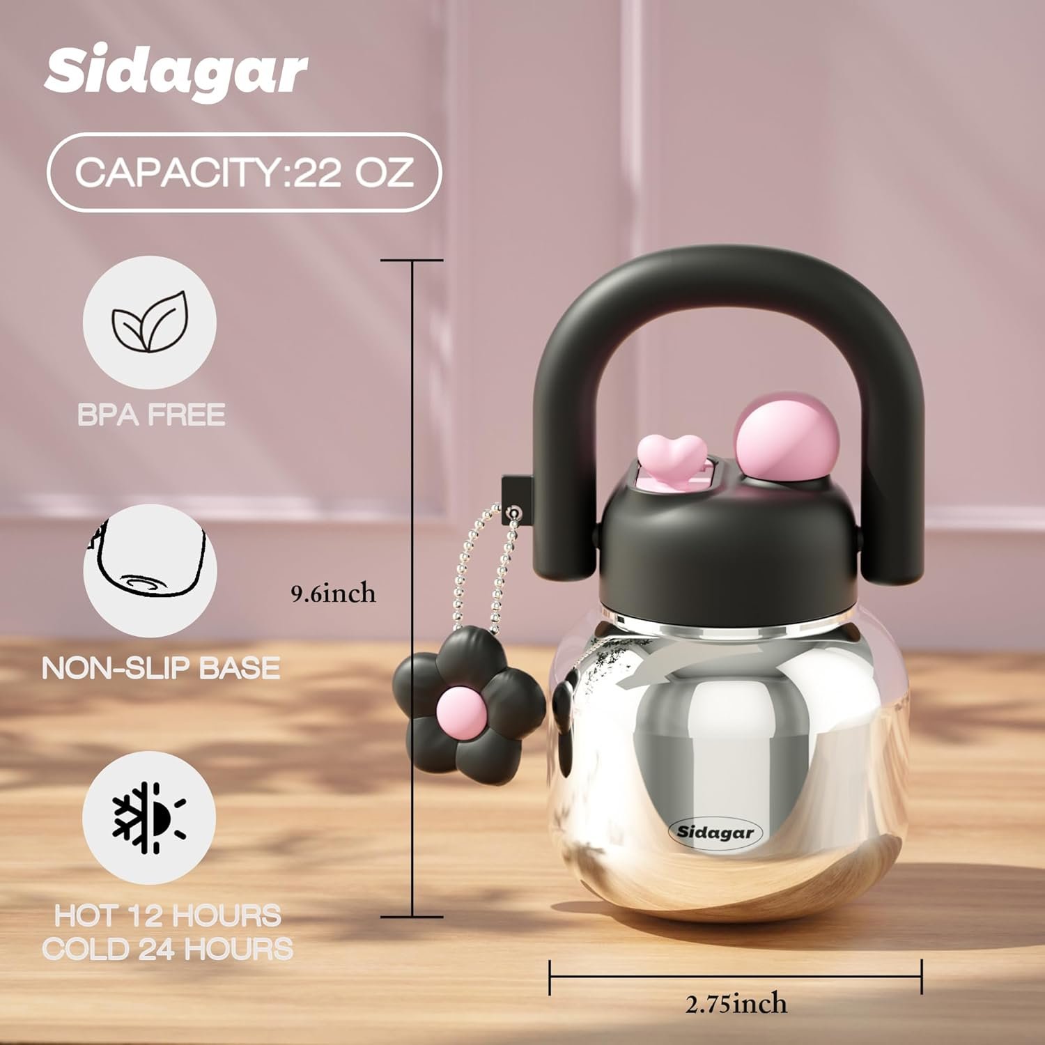 22 oz Tumbler with Straw and Carry Handle, Wide Mouth Insulated Stainless Steel Travel Water Bottle, Chrome Metallic Aesthetic Cool Silver Flask, Kawaii Black & Pink Bottle Trendy Gift for Her