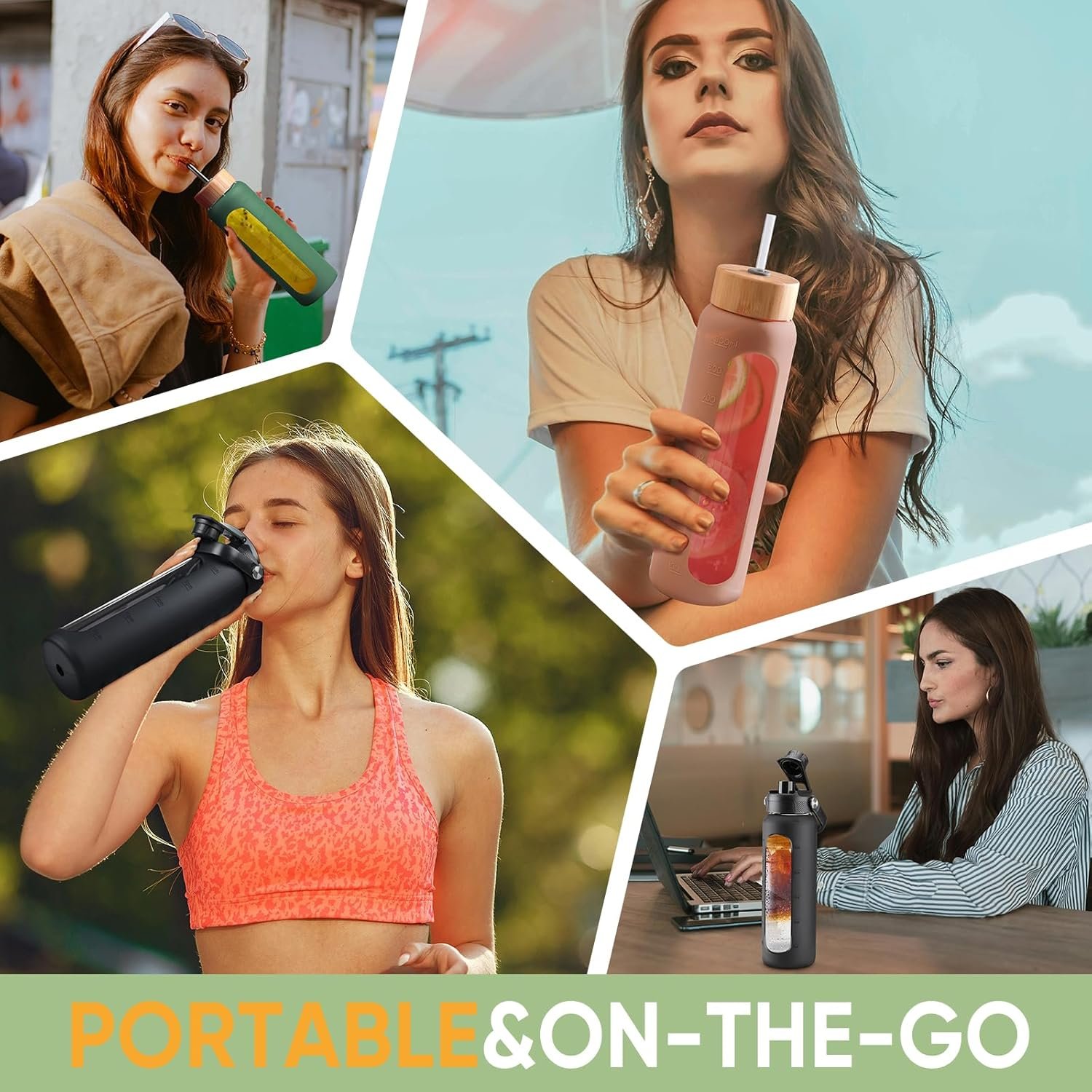 PURE & DURABLE: Our borosilicate glass water bottle is free from BPA, BPS, PVC, and lead. The stylish silicone sleeve adds extra protection against slips and falls, while the thicker base makes the glass water bottles 32oz less prone to breakage than regular glass