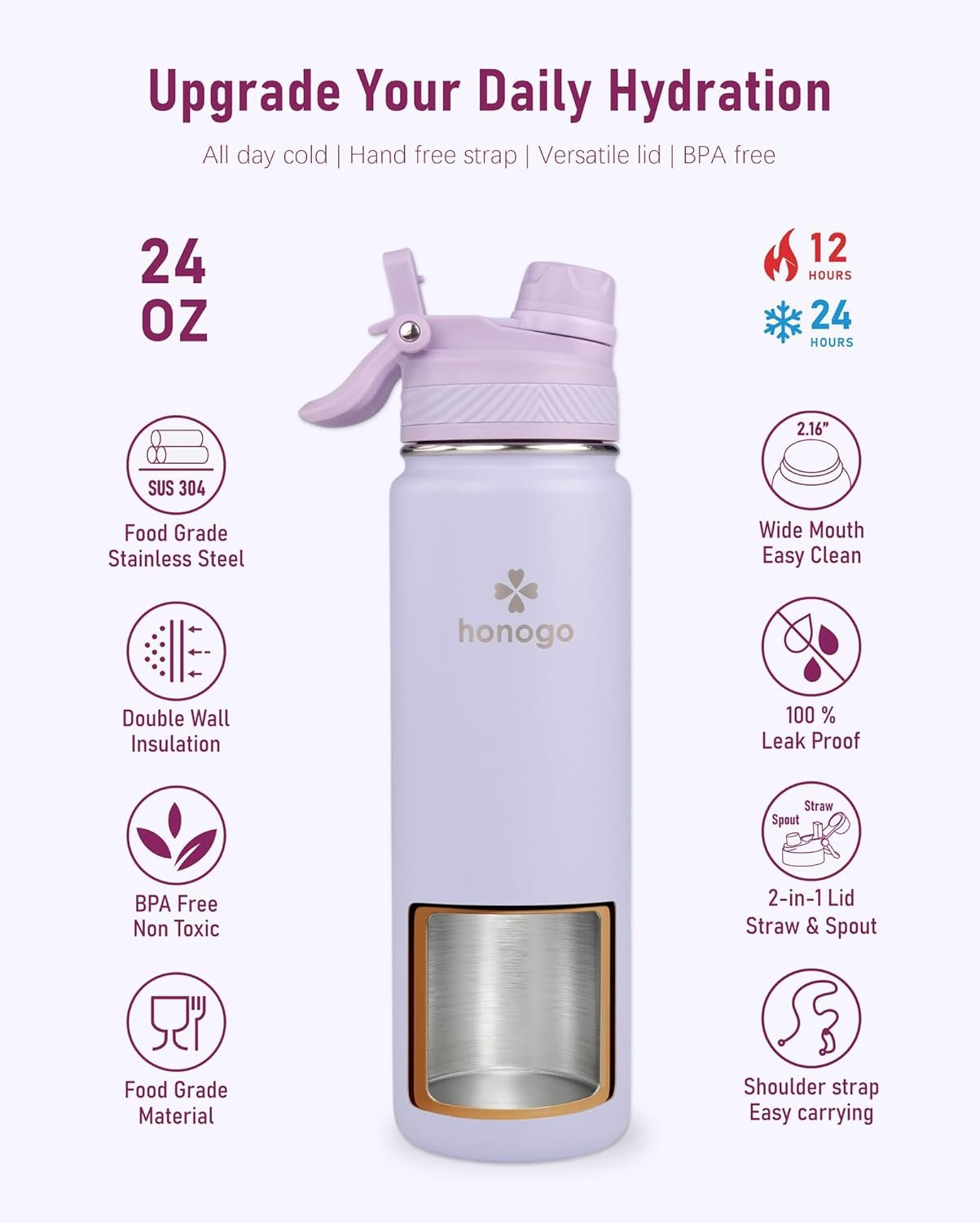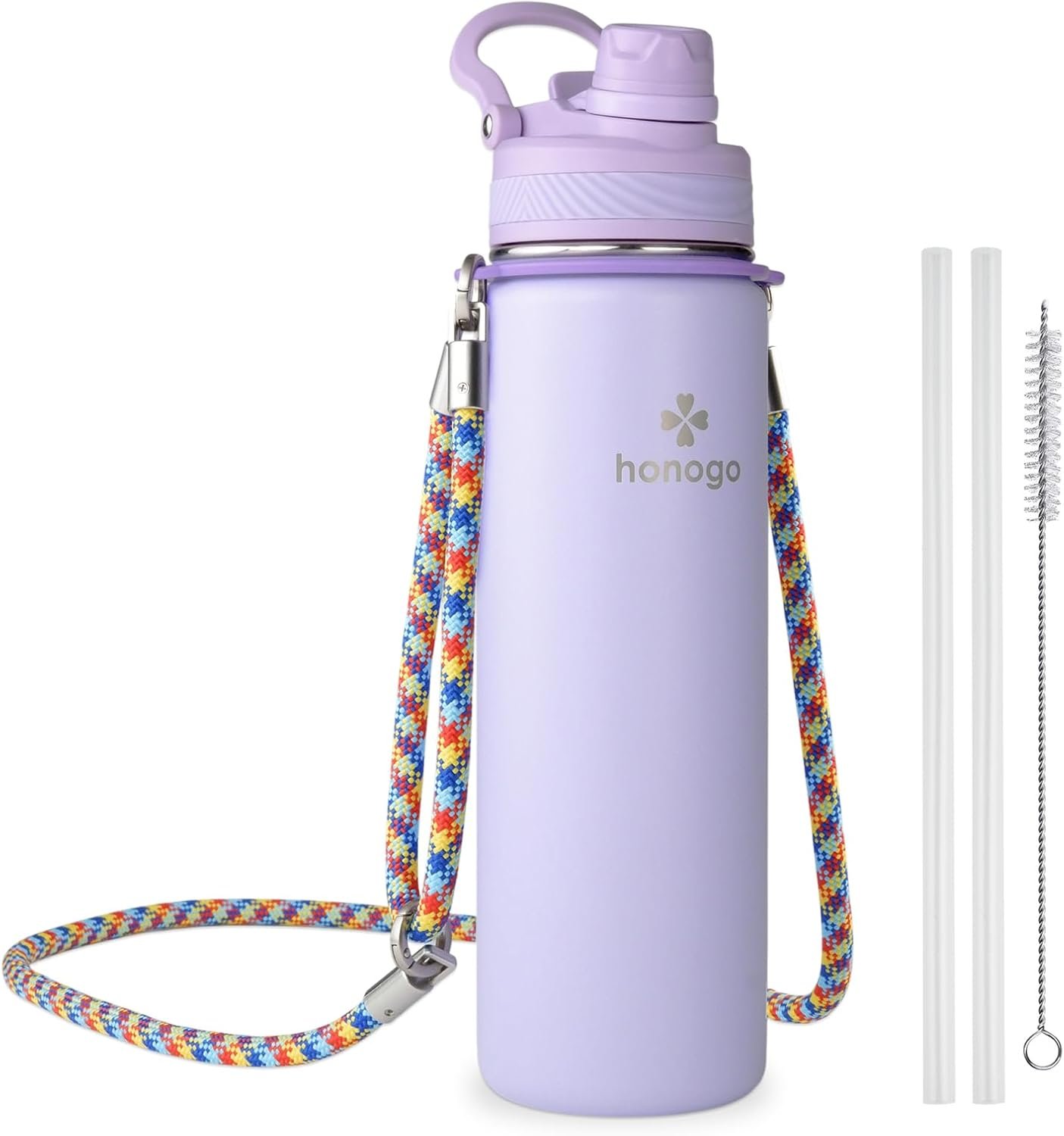 24 oz Insulated Water Bottle with Shoulder Strap, Stainless Steel Tumbler with 2-in-1 Straw & Spout Lid, Fashion Water Flask for Women & Girls. Keep Cold 24H / Hot 12H, BPA Free (Light Purple, 24 oz)