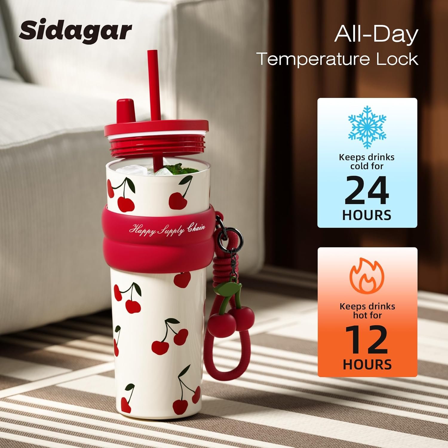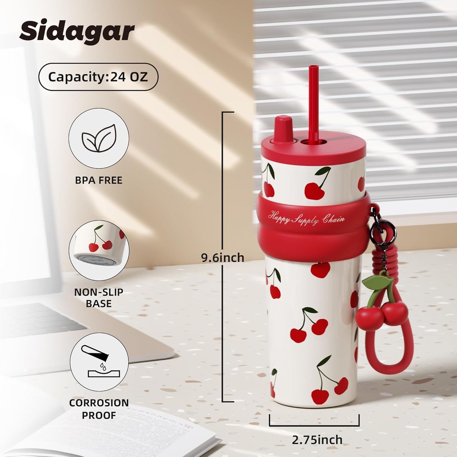 24 oz Stainless Steel Tumbler with Lid and Straw, Insulated Water Bottle Leak Proof for Hot and Cold, Portable Travel Coffee Mug, Reusable Coffee Cup for Women, Cherry