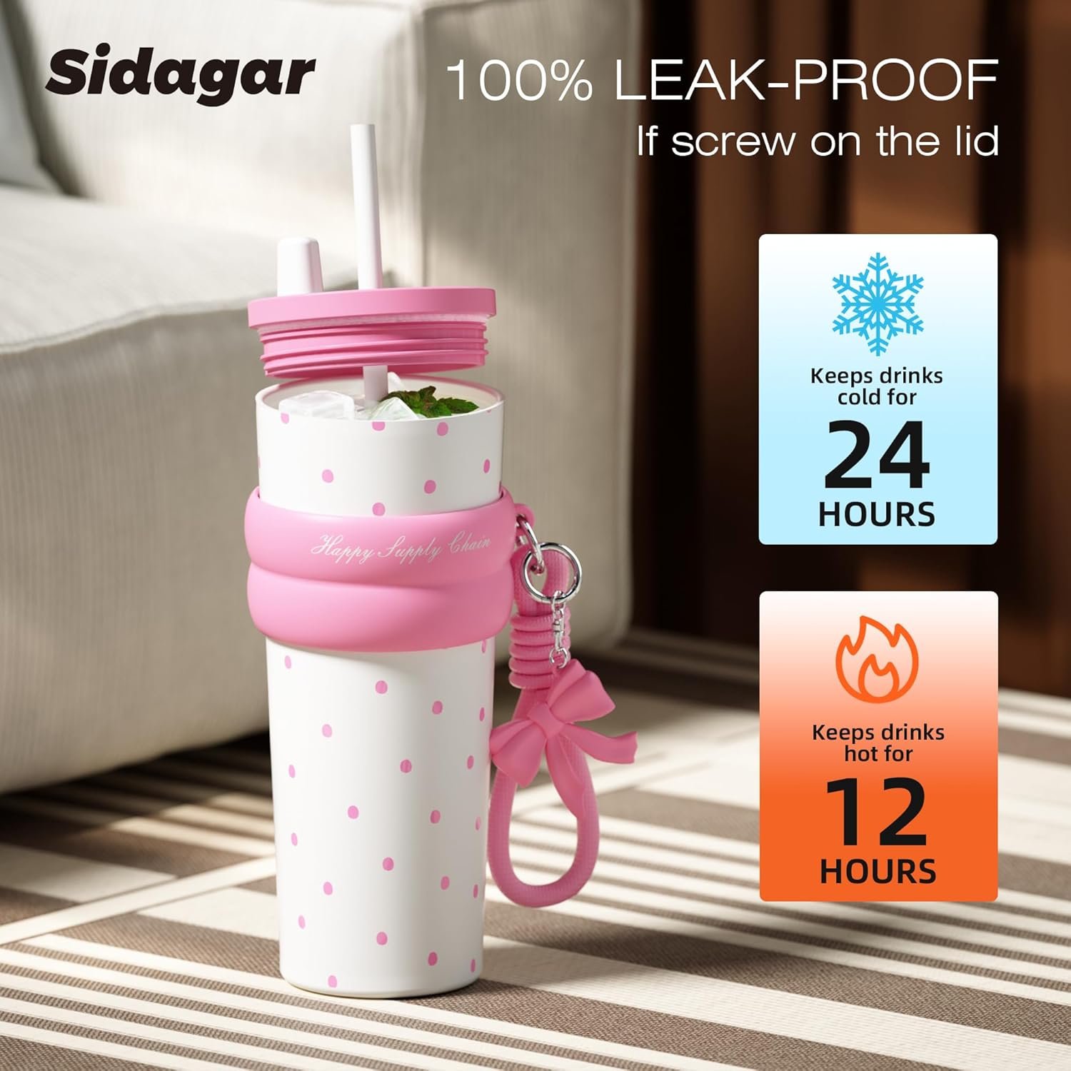 24 oz Stainless Steel Tumbler with Lid and Straw, Insulated Water Bottle Leak Proof for Hot and Cold, Portable Travel Coffee Mug, Reusable Coffee Cup for Women, Pink Dot