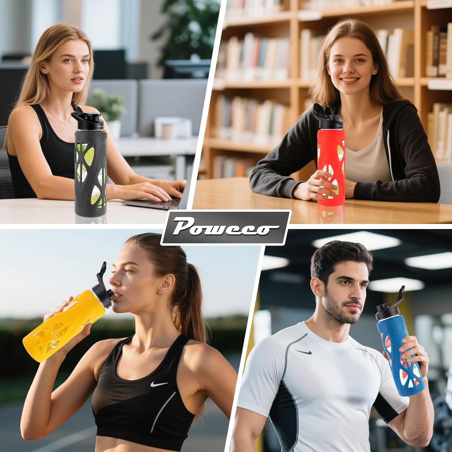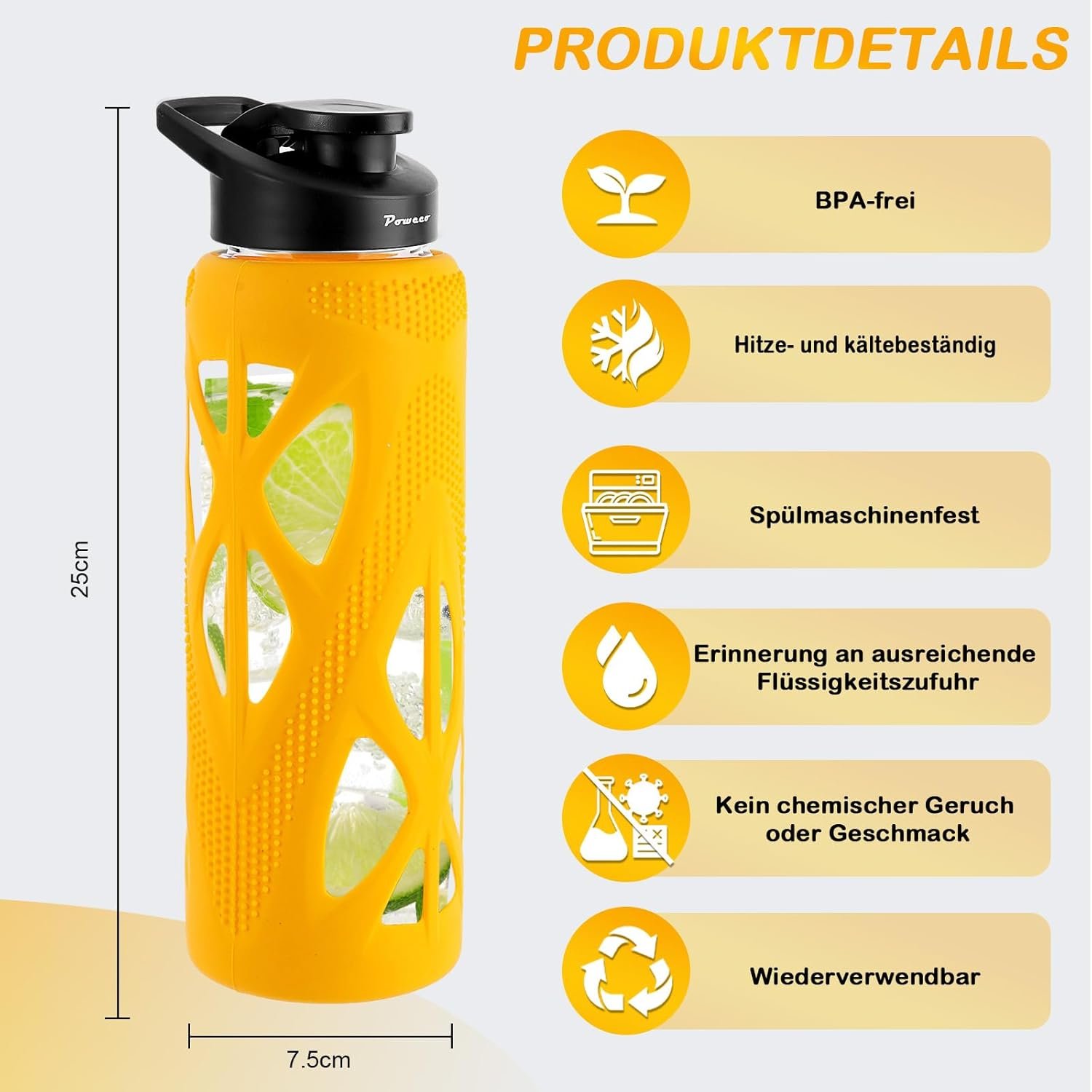 𝟭.𝗣𝗥𝗘𝗠𝗜𝗨𝗠 𝗛𝗜𝗚𝗛 𝗕𝗢𝗥𝗢𝗦𝗜𝗟𝗜𝗖𝗔𝗧𝗘 𝗚𝗟𝗔𝗦𝗦- Crafted from durable, high-quality borosilicate glass, this 24 oz water bottle is built to withstand daily use and temperature changes. The sturdy design ensures long-lasting durability, offering a pure taste with every sip.