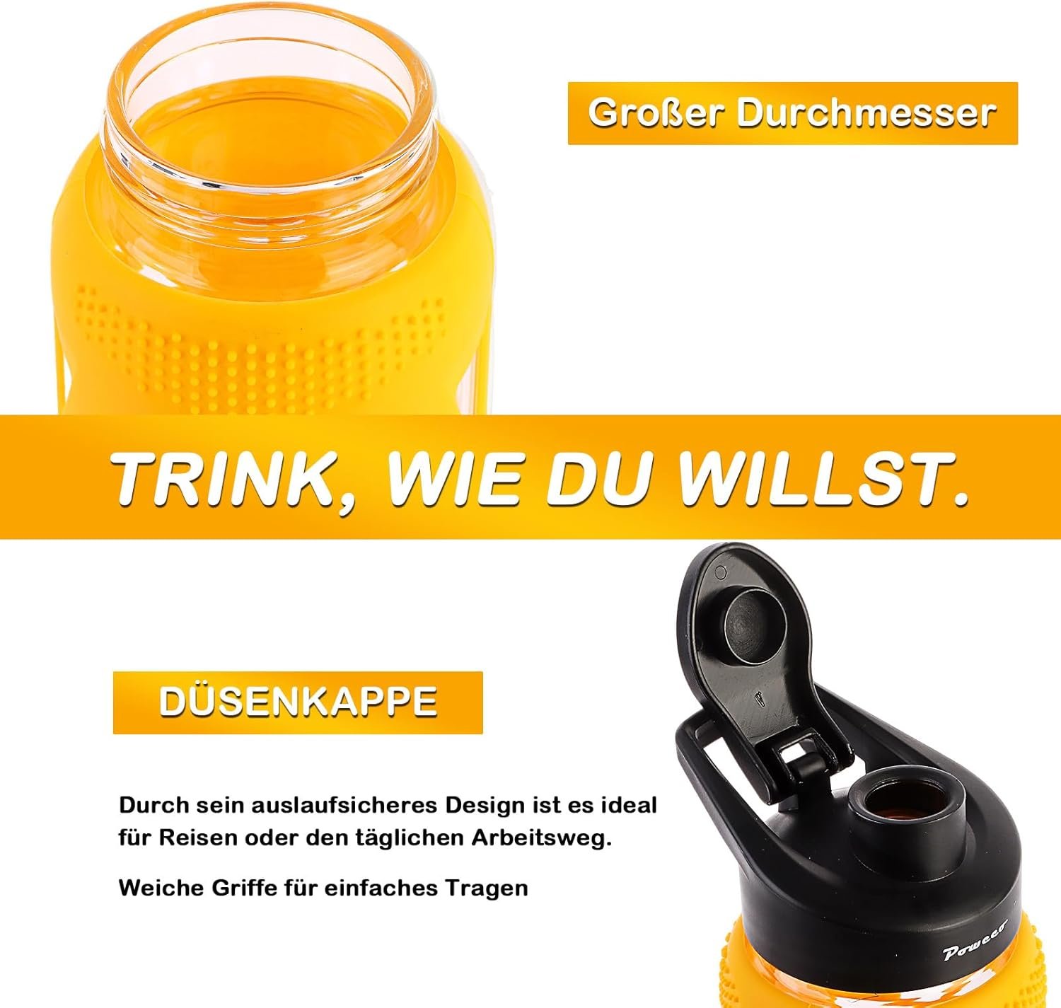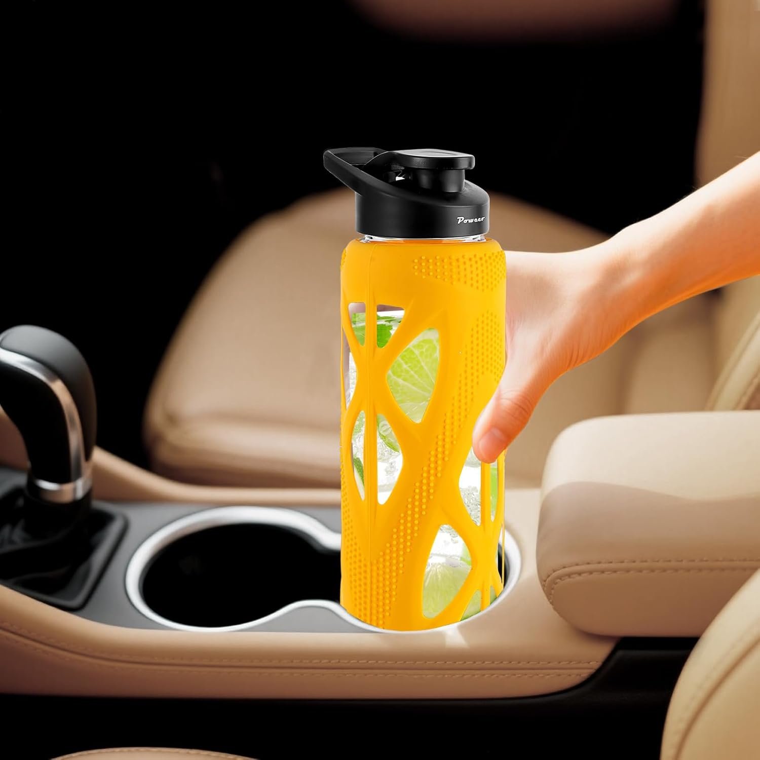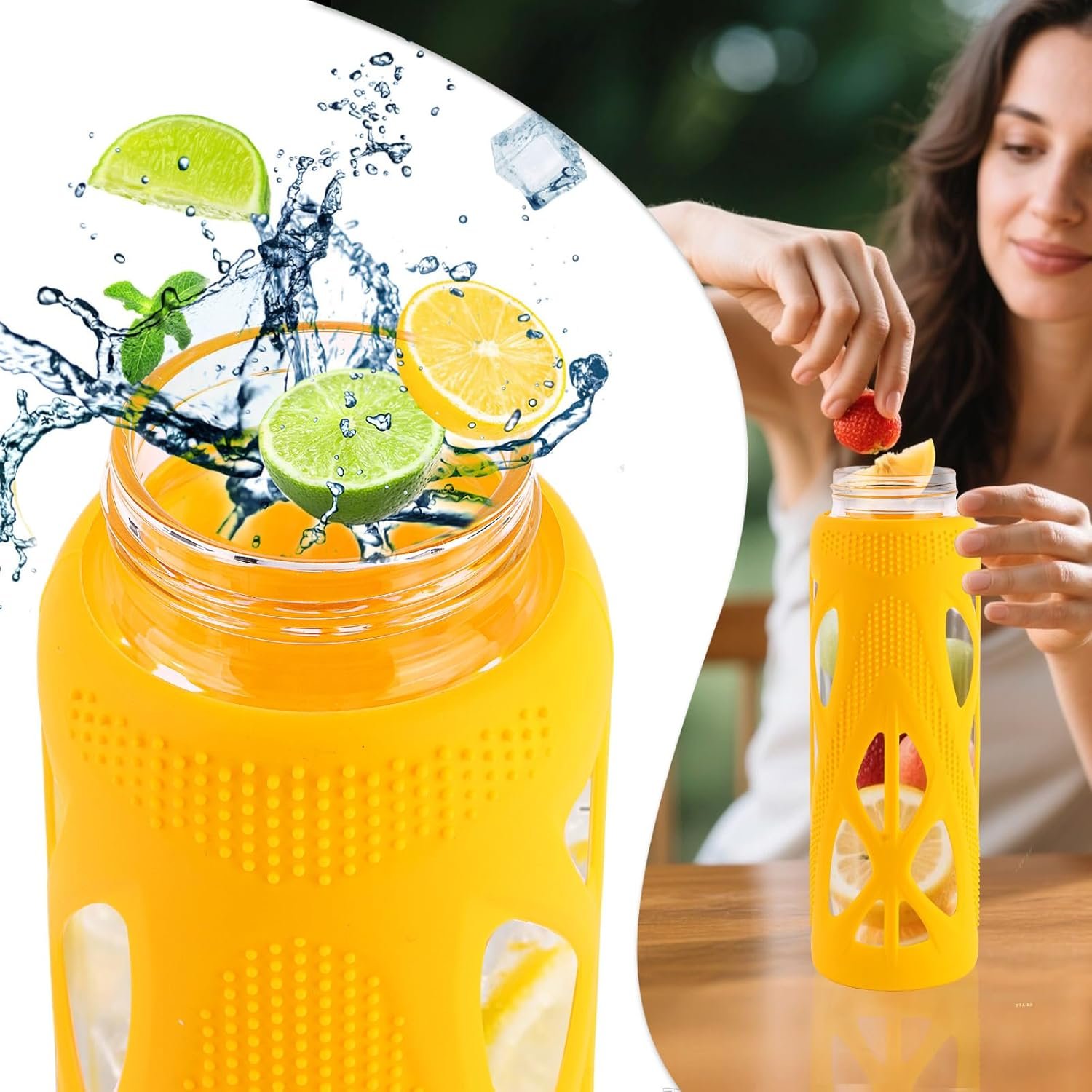 24oz Glass Water Bottle with Silicone Sleeve and Spout Lid – High Borosilicate Glass, Wide Mouth, Leakproof with Handle, BPA-Free, Perfect for Hydration on the Go (Bright Yellow)
