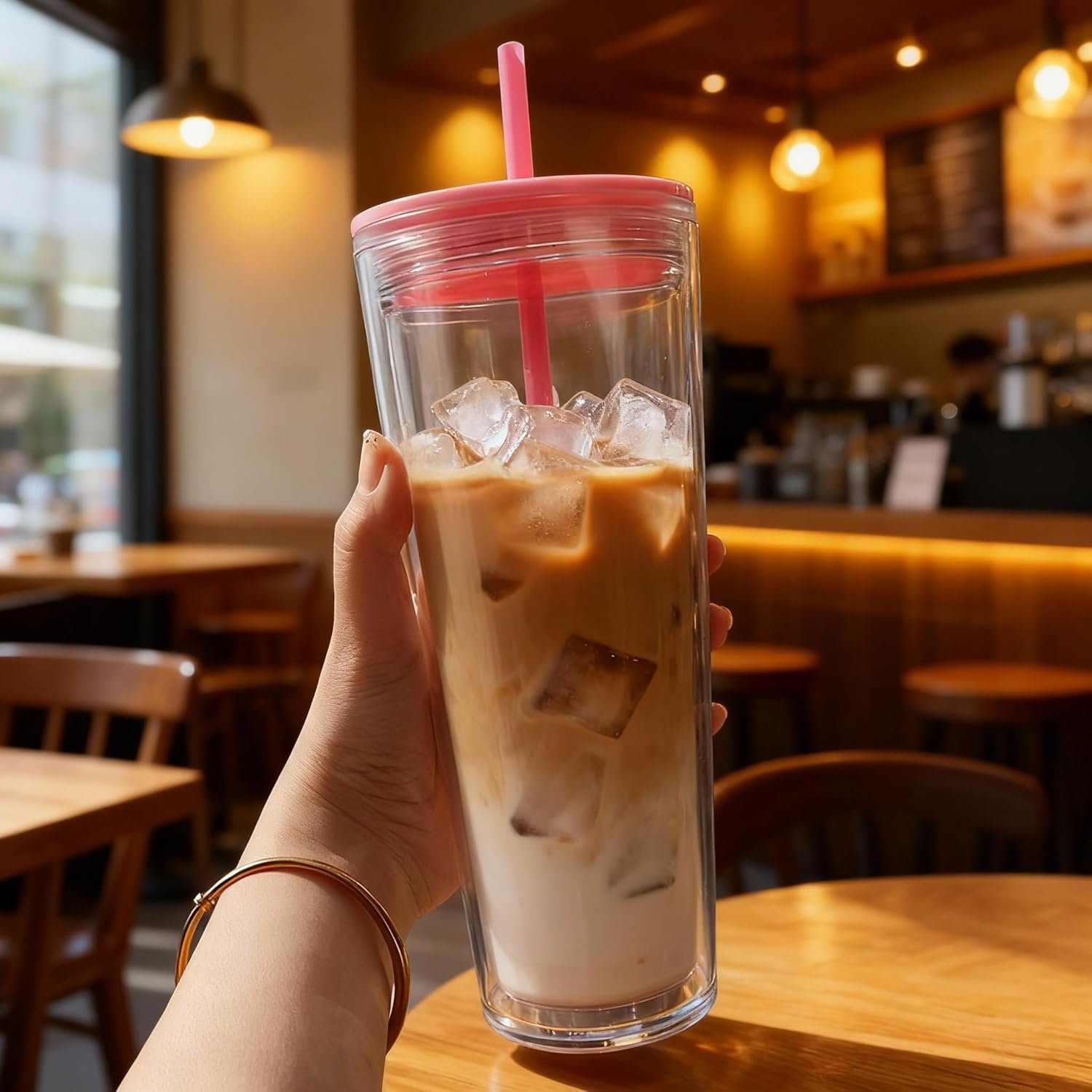 24oz Tumbler with Lid and Straw, Leak Proof and Double Wall Insulated Reusable Plastic Cups,Travel Reusable Iced Coffee Cup (1, Pink)