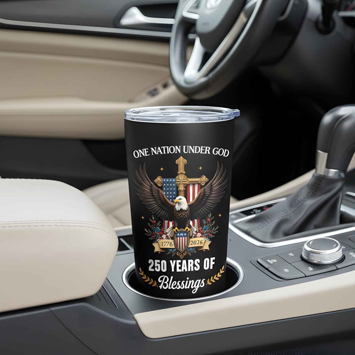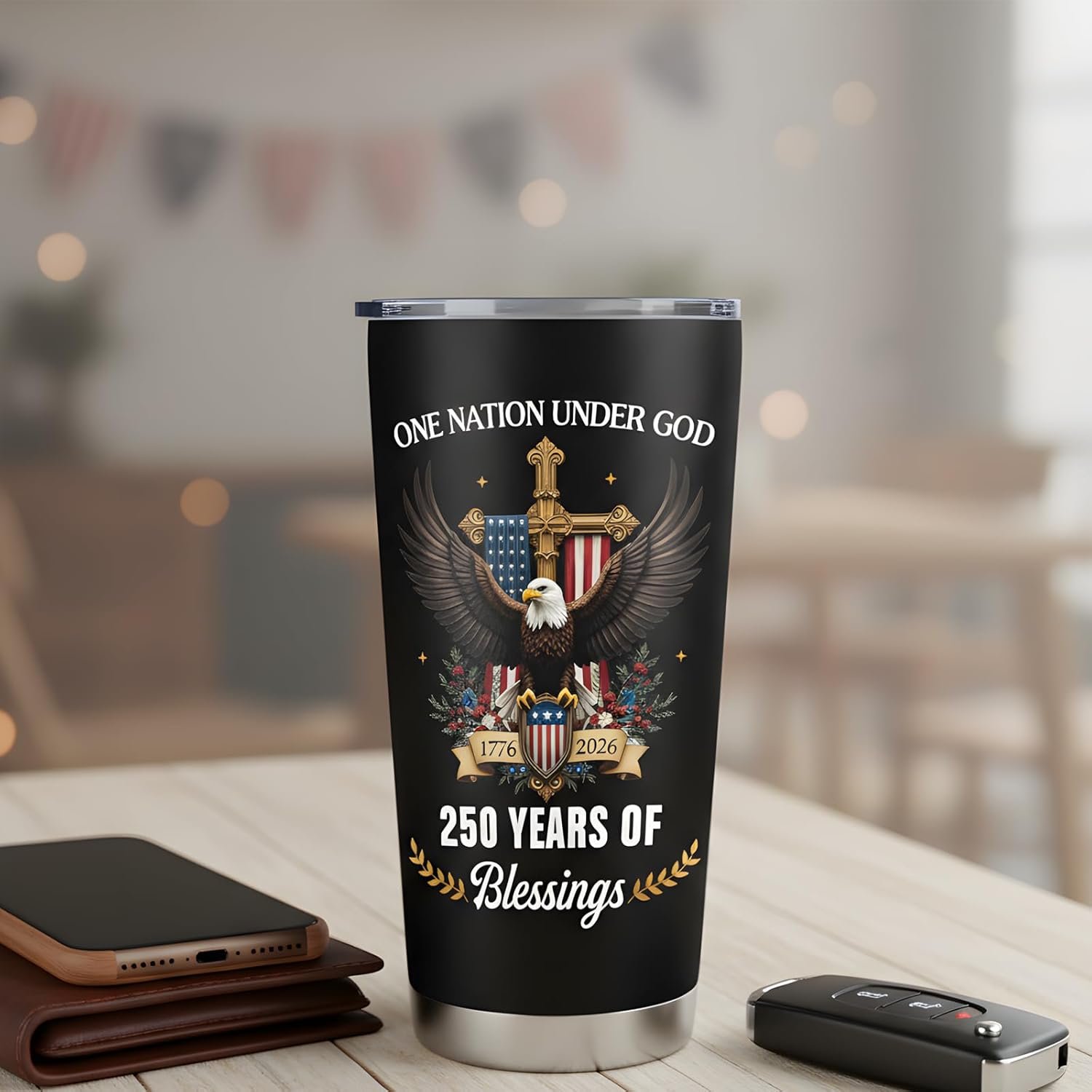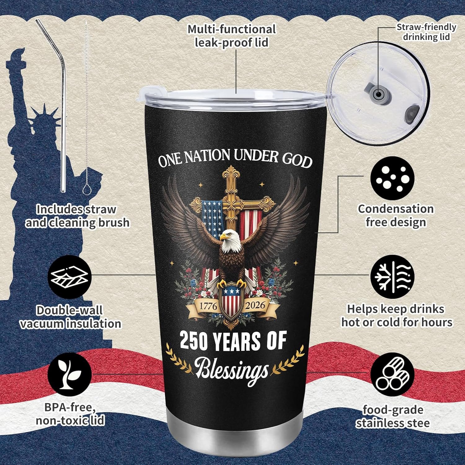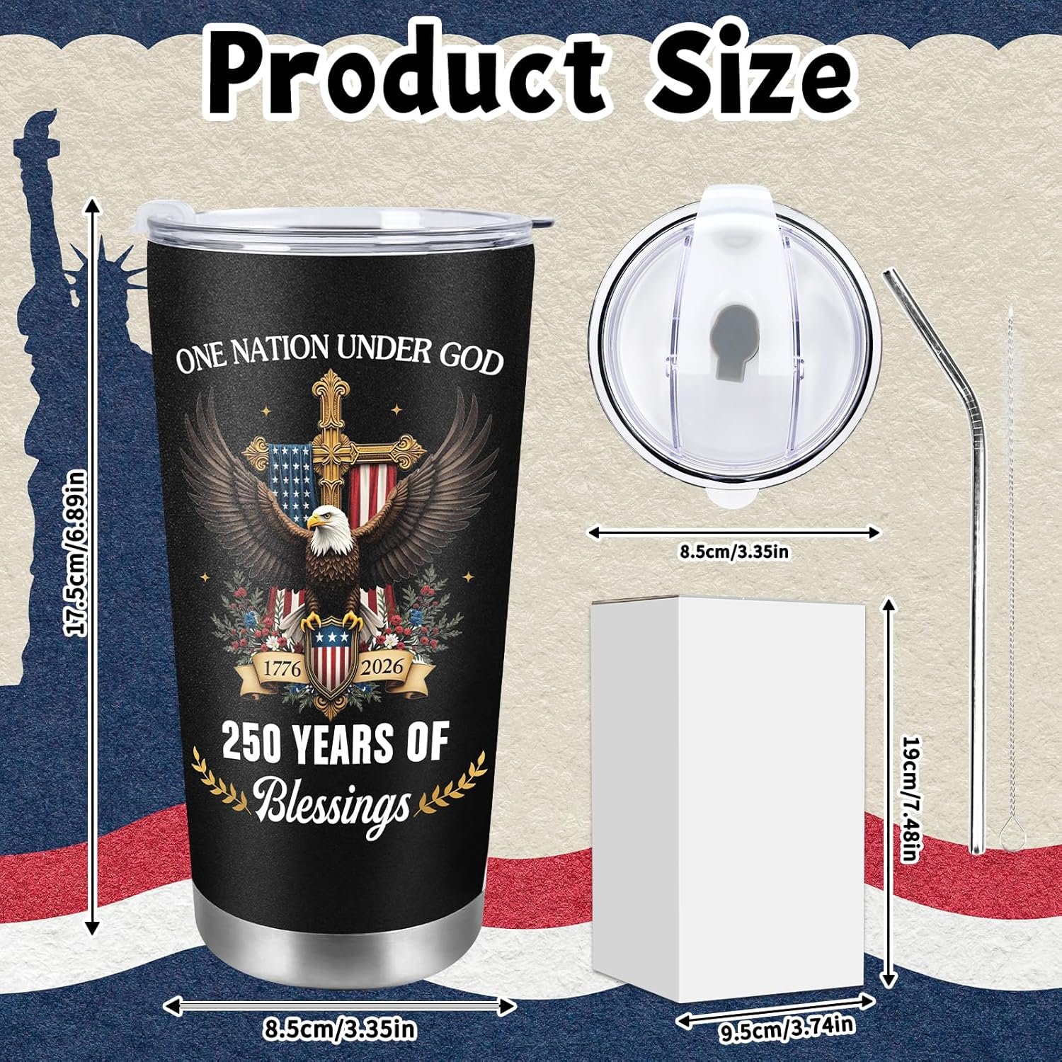 250 Years America Anniversary Tumbler, 20oz USA 250th Birthday Stainless Steel Insulated Tumbler, One Nation Under God Office Decor Desk Accessories Gifts for Coworkers