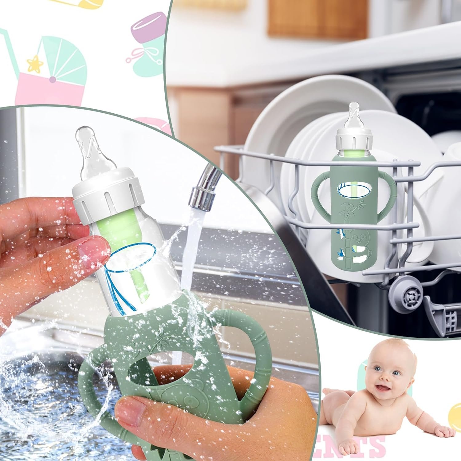 Comfortably Use of Bottles – The fashion design silicone sleeve for Newborn baby bottles help grip for mom and also helps baby hold his bottle when it comes time for them to hold it . These bottle handles can be used for clean by dishwashers ,easy to clean.The silicone sleeve for Dr. Brown’s bottle comes in cute colors and an adorable little cut out, so that you can easy to know amount of milk left
