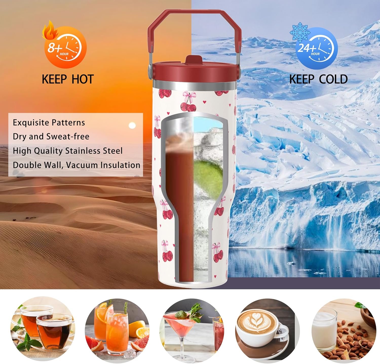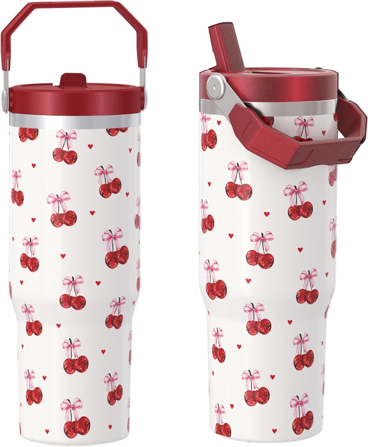 Beautiful and Practical: Our tumbler with handle combines cherry and bow elements, with a mysterious and unique style that is unique and eye-catching. The 30-ounce capacity takes into account practicality. Whether for daily use or traveling, this strawberry prints tumbler is the first choice.