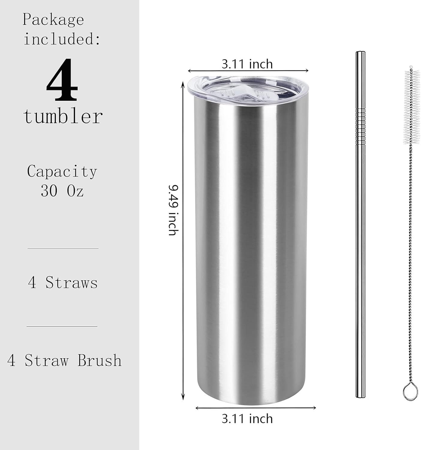 30 Oz Straight Skinny Tumbler Set, Stainless Steel Slim Skinny Travel Tumbler Bulk, Birthday Diy Gift For Women Friends Sisters, 4 Pack, Silver