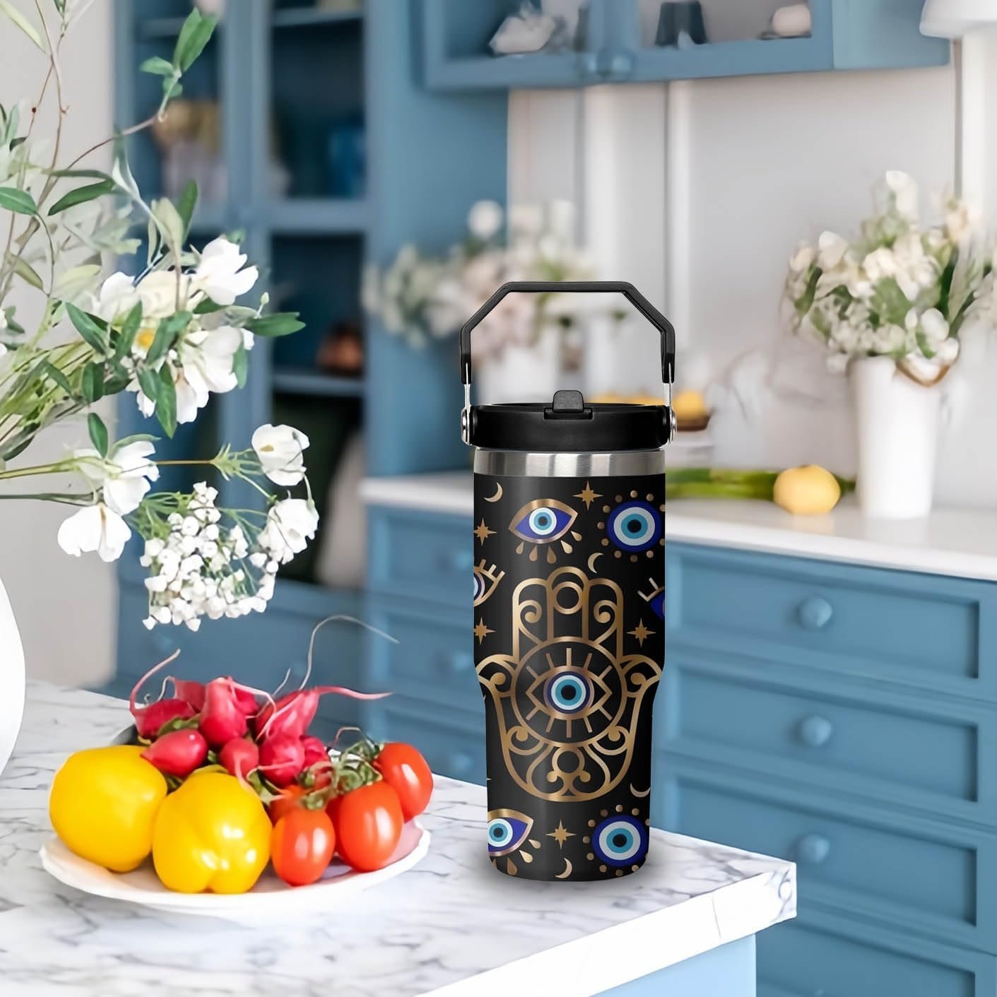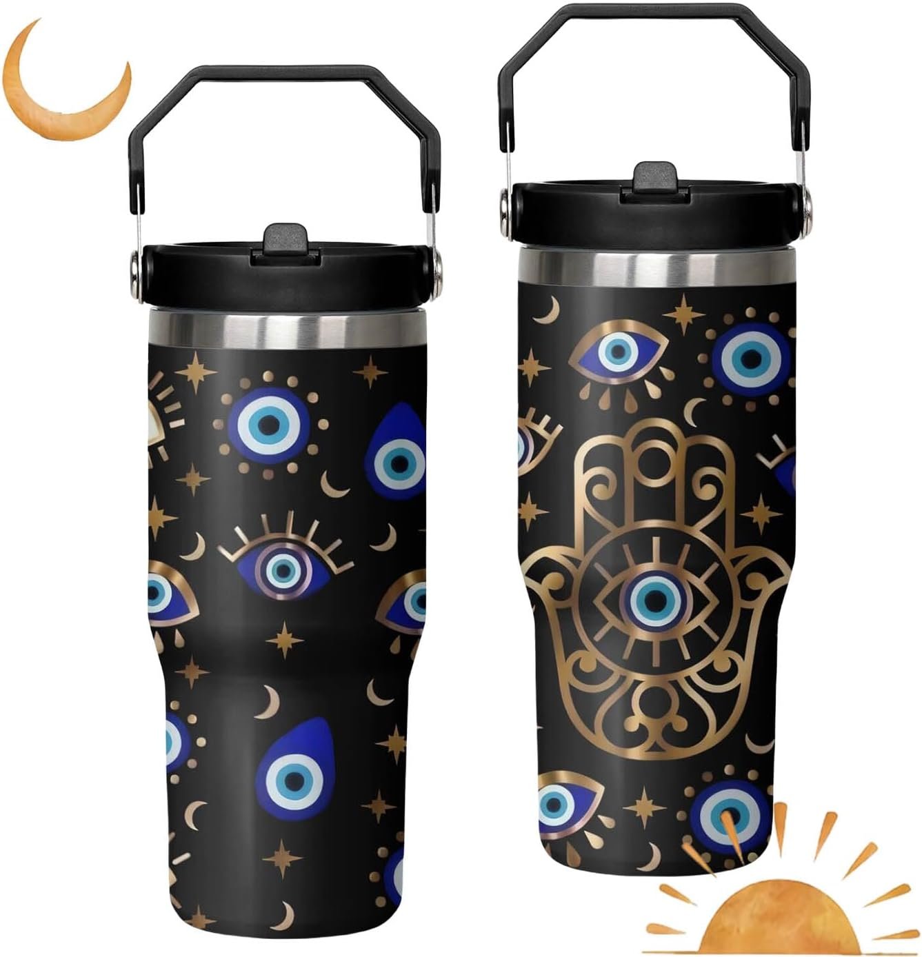 30oz Evil Eye Tumbler with Handle and Flip Straw, Evil Eyes Hand Stainless Steel Insulated Cup, Travel Coffee Mug Water Bottle, Birthday Gifts for Women Men