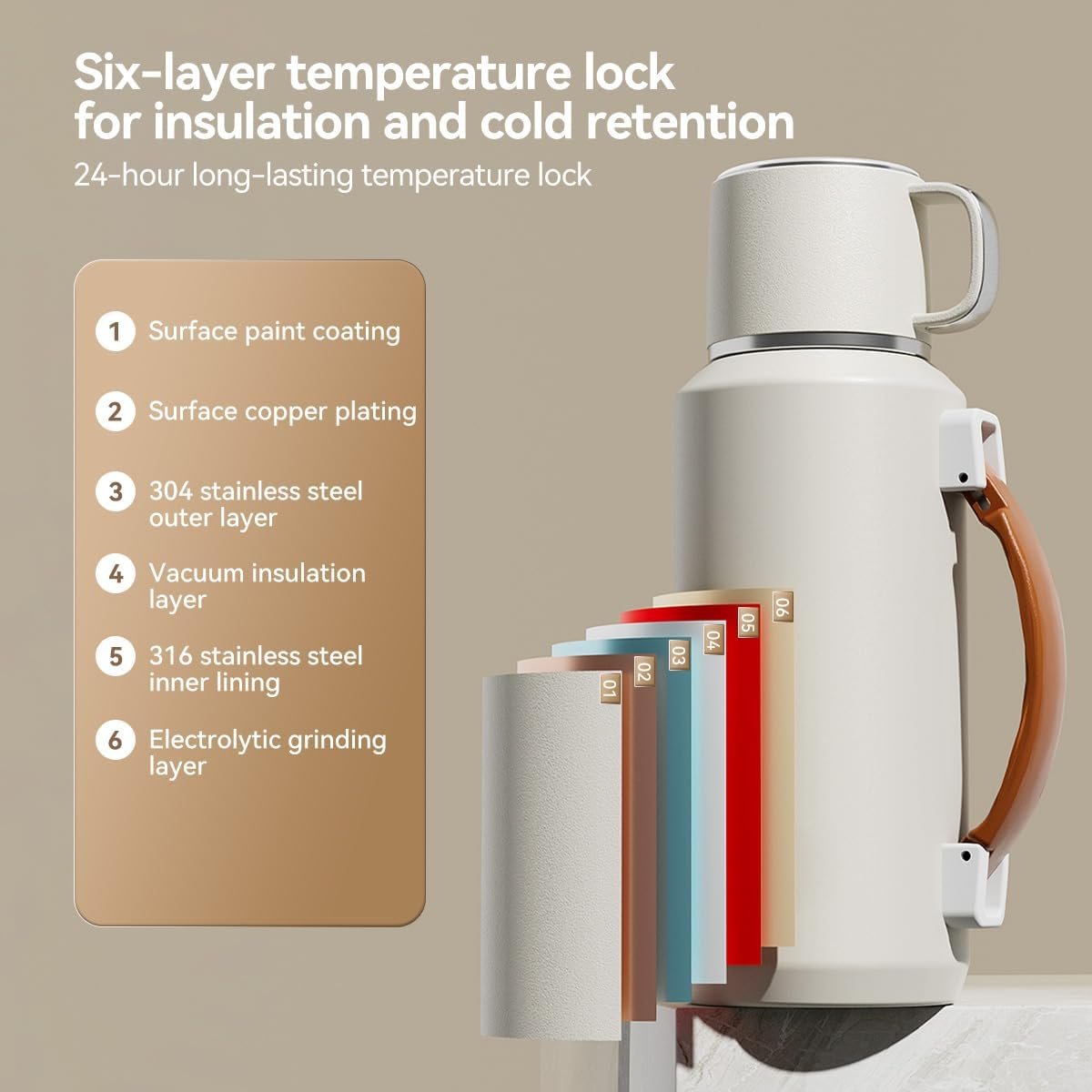VISTATROY Stainless Steel Vacuum Insulated Bottle is crafted from food-grade SUS 316 stainless steel, ensuring a safe and healthy drinking experience. Its generous 0.8–1.5 liter capacity and 24-hour heat retention make it ideal for diverse scenarios. The lid design accommodates both direct drinking and pouring, while the lip-contoured spout delivers an exceptional drinking experience. This healthy and practical thermos lets you fully enjoy outdoor moments without worrying about thirst.