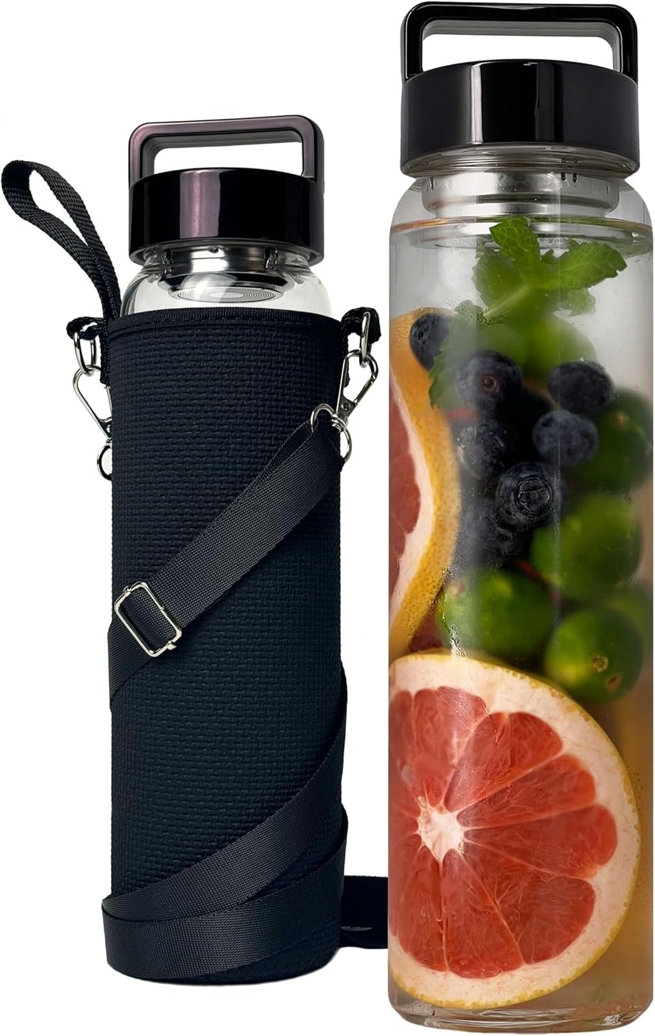32 oz Clear Glass Water Bottle | Cold Brew Fruit Infuser Water Bottle (Black Lid)