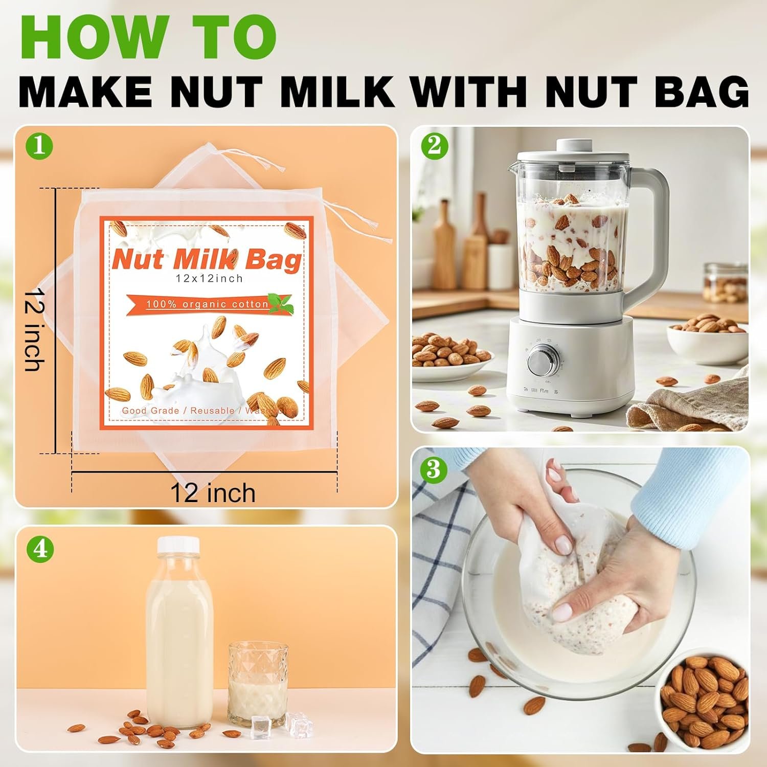 [Nut Milk Strainer Bags]: Includes two 12″x12″ nylon bags with ultra-fine mesh for silky-smooth nut milk, cold brew, or juice. Featuring quick-dry fabric—simply rinse and reuse sustainably.