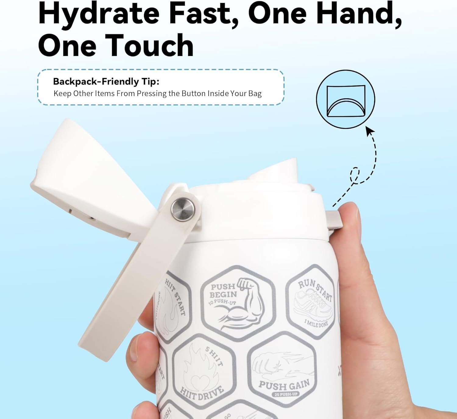 32 oz Motivational Insulated Stainless Steel Water Bottle for Sports, Gym & Travel, 2-in-1 Push-Button Spout & Quick-Flip Straw, Leak-Proof BPA-Free, Keeps Cold 30H, with DIY Fitness Stickers