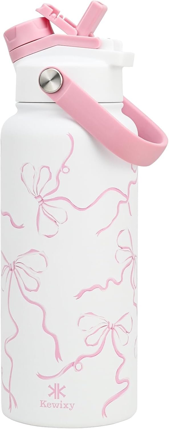 32 oz Pink Water Bottle, 2-in-1 Lid, Straw & Spout with Protected, Leak Proof, Keep Cold, Stainless Steel, Metal, Reusable, Handle, for Travel, Gym and School, Breeze Pink Bow