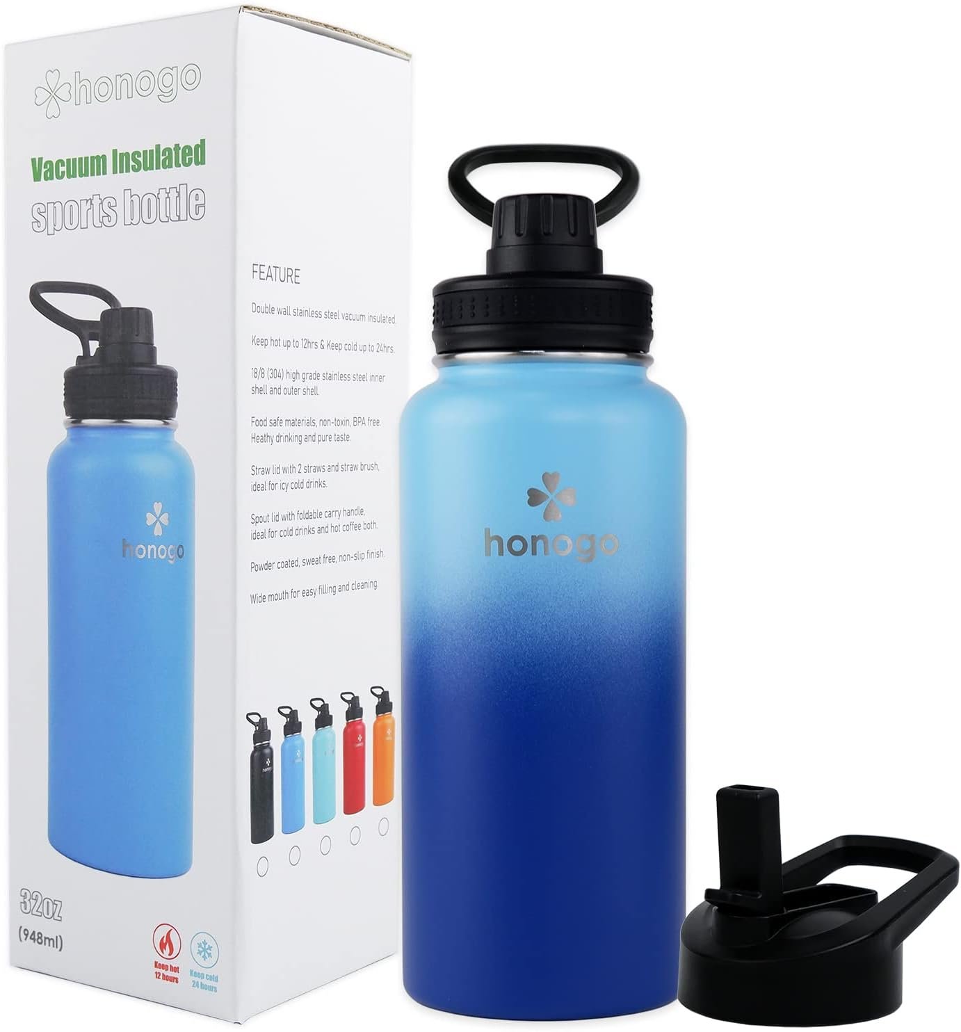 INNOVATIVE VACUUM INSULATION: With double layered vacuum-insulated, Honogo 32 ounce thermo bottle provide perfect termperature control, keep beverages cold up to 24 hours, and hot up to 12 hours with fresh taste. 100% sweat free and no condensation