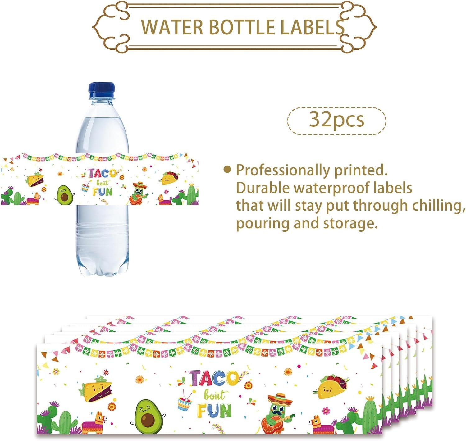 32pcs Taco Bout Fun Water Bottle Labels, Mexican Birthday Water Bottle Wrappers for Kids, Mexican Themed Baby Shower/Gender Reveal Party Decoration
