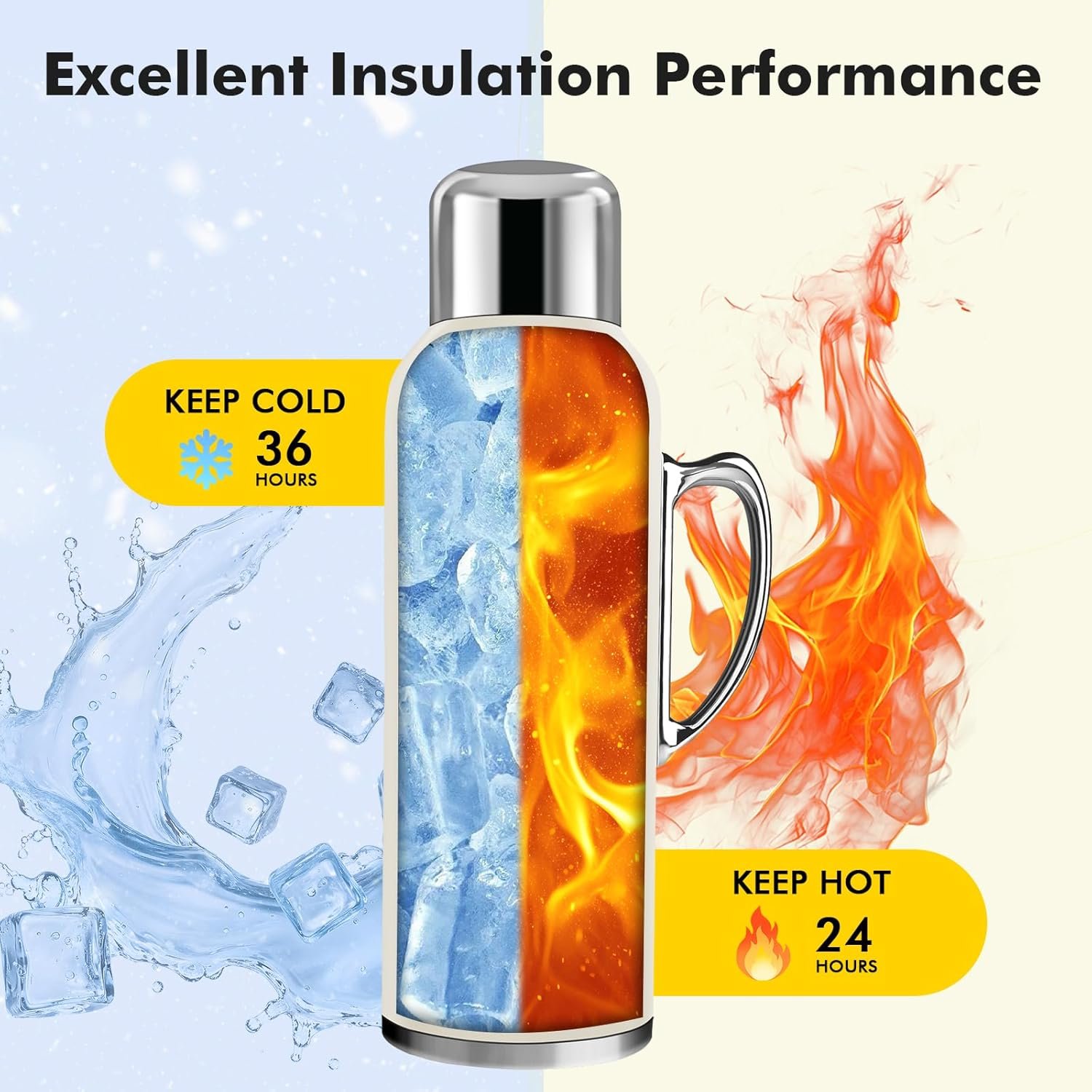 34 oz Insulated Water Bottle, Double Wall Vacuum Stainless Steel Water Flask Jug with Handle & Metal Mechanical Temperature Measuring Cup Lid, Leakproof Travel Bottle Keep Cold 36h Hot 24h