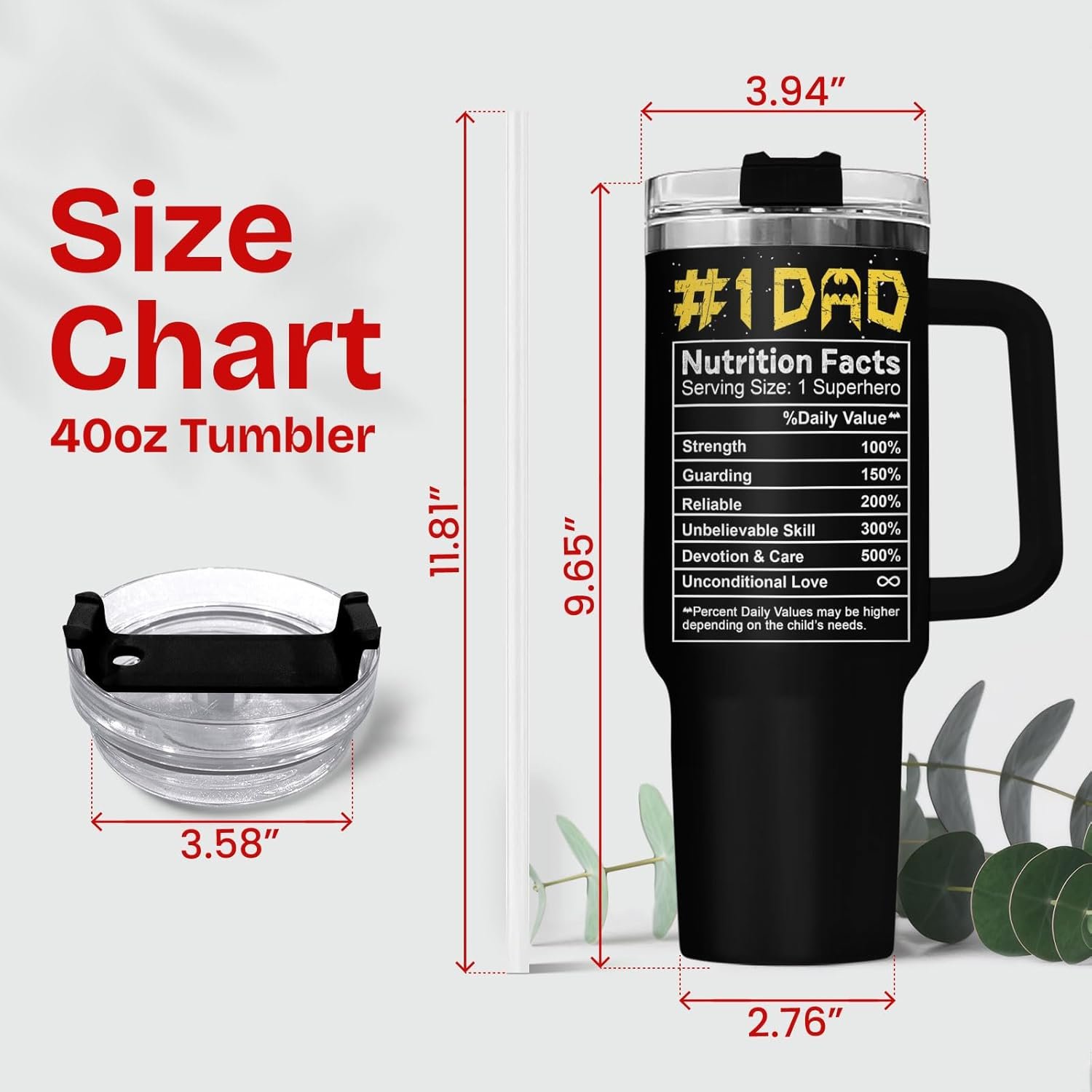 Super Nutrition Facts: The reverse side displays a creative “#1 Dad Nutrition Facts” table, listing heroic traits like 100% Strength, 200% Reliable, and ∞ Unconditional Love.