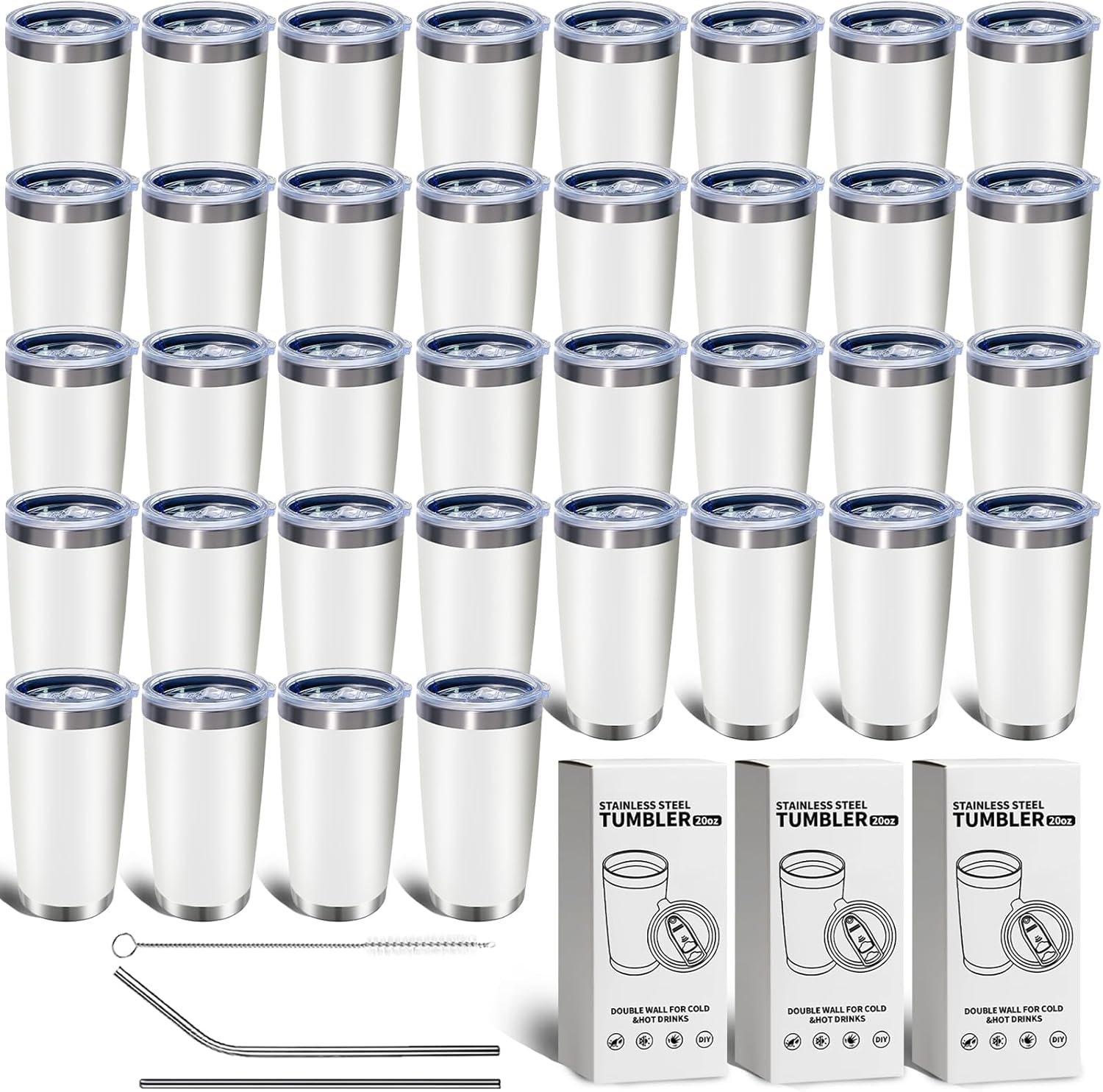 36 Pack, 20oz Stainless Steel Bulk Tumblers with Lids and Straws, Leakproof Double Wall Travel Mug for Hot/Cold Drinks, Home Office Outdoor Party Use, Durable Powder Coated Insulated Cup/White