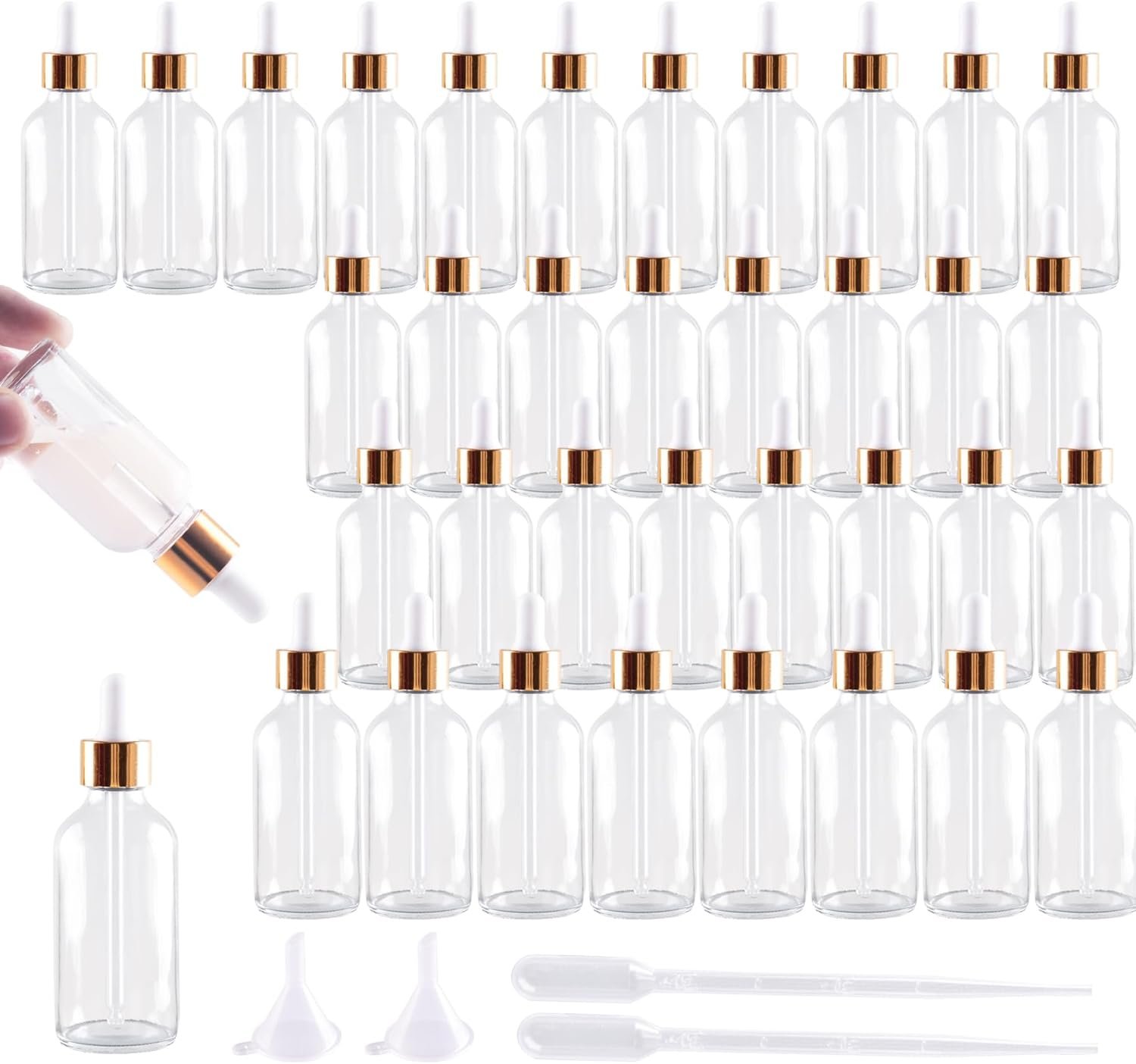 36 Pack 2oz Clear Glass Dropper Bottles, 60ml Glass Eye Dropper Bottles for Essential Oils, Perfumes, Laboratory Use (Gold & dropper, 2oz-36Pack)