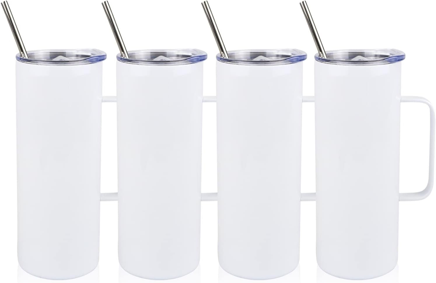 4 Pcs Sublimation Blank Skinny Tumbler 20 OZ White Mugs with Handle and Straw Double Wall Stainless Steel Coffee Travel Straight Mug with Sliding