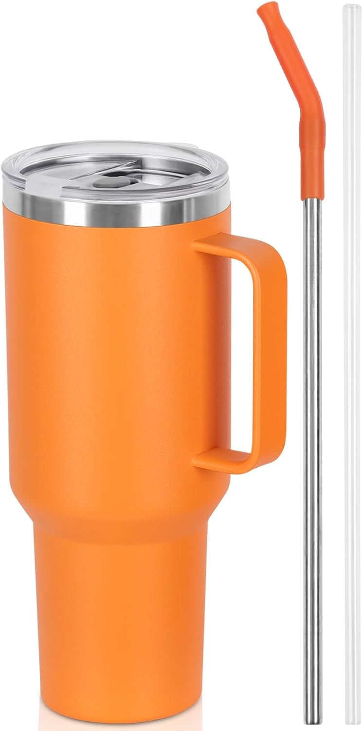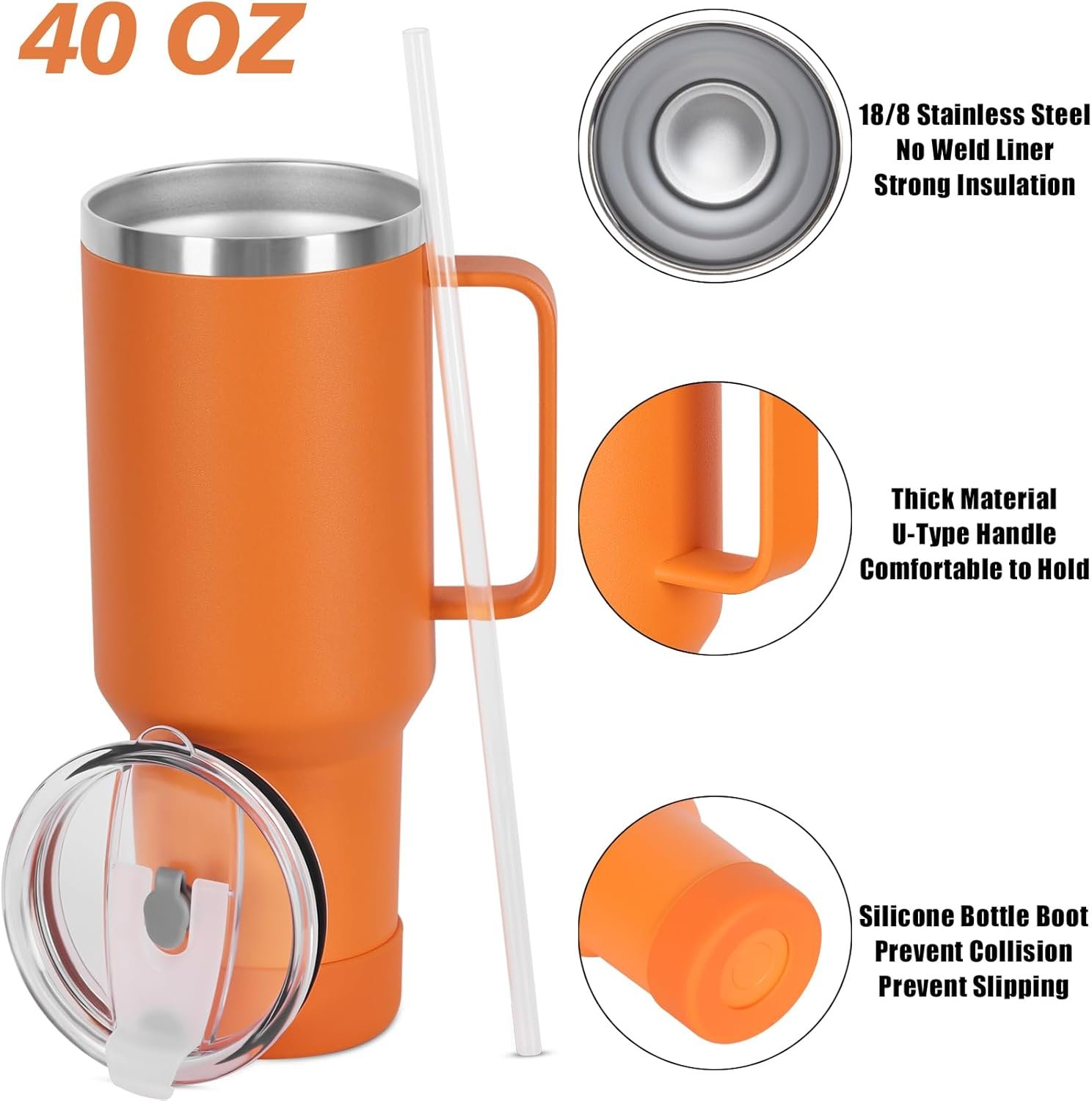 40 Oz Tumbler with Handle and Straw, Stainless Steel Double Wall Vacuum Insulated Cup, 40 OZ Travel Coffee Mug Bulk with Silicone Water Bottle Boot(Orange)