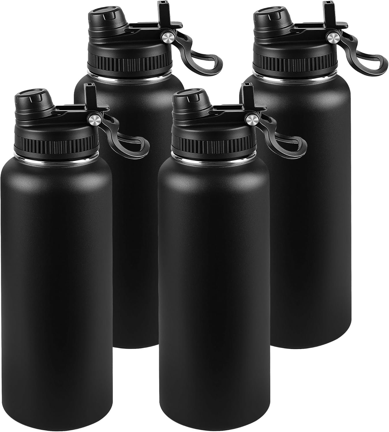 40oz Insulated Water Bottle – 2-in-1 Leak-Proof Lid (Sip/Straw) + Handle, Stainless Steel Bottle Bulk for Sports, Commuting, Office Work, Outdoor Activities, Black, 4 Pack