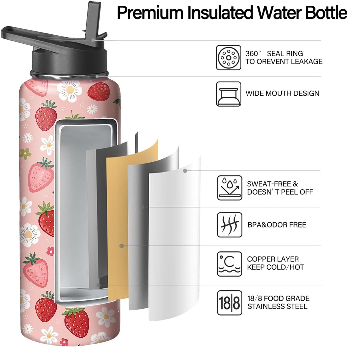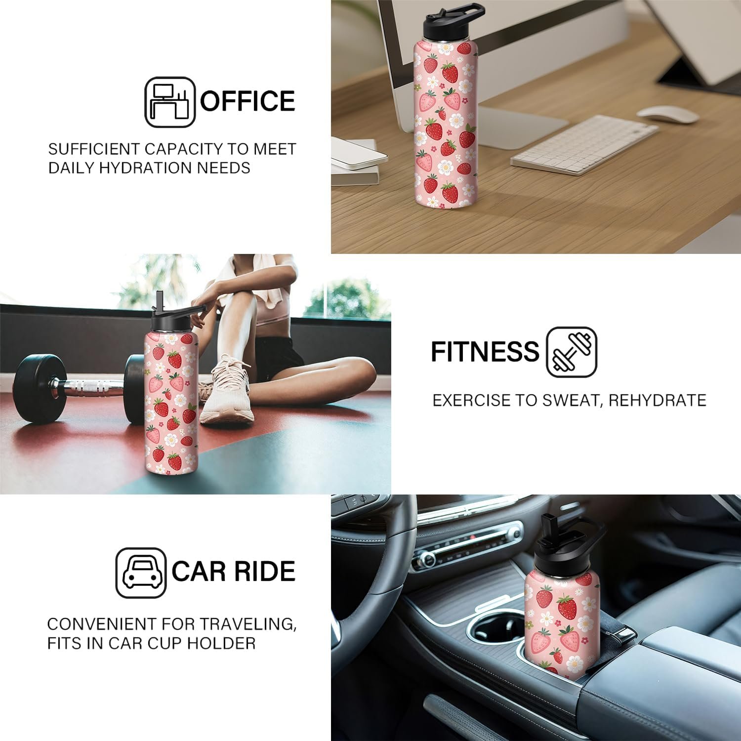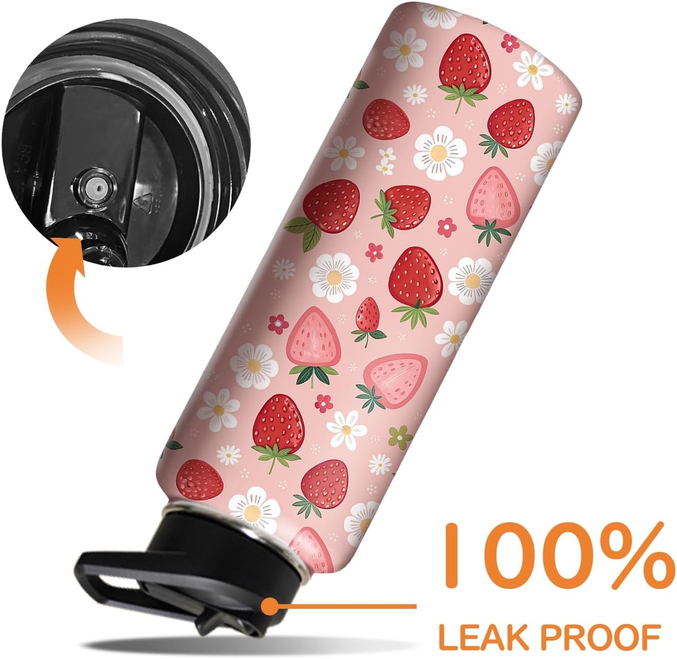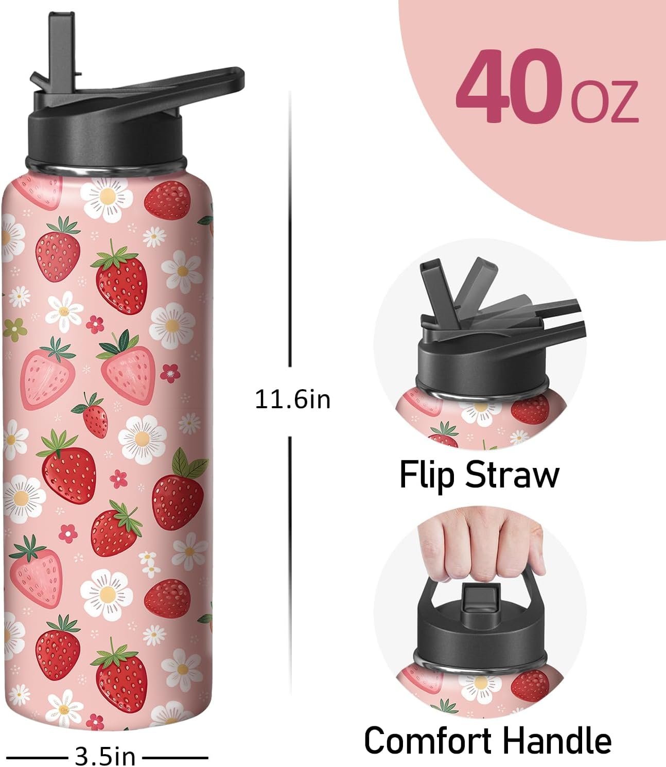 40oz Pink Strawberry Water Bottle with Handle and Flip Straw, Sports Stainless Steel Insulated Cup Travel Coffee Mug Tumbler, Birthday Mothers Day Chritmas Gifts for Women