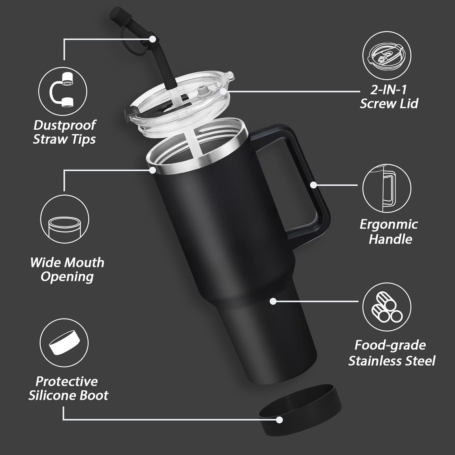 40oz Tumbler with Handle and Straw Lid – Insulated Water Bottle Keep Cold-34H, Stainless Steel Hydro Cup Travel Flask with Dust-proof Cap, Rubber Base, Coffee Mug for Men Women