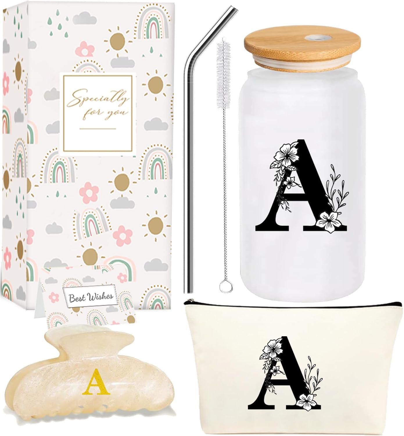 Personalized Letter Cup Gift : This elegant gift set includes 1x 16oz letterr glass tumbler , 1x matching letter makeup bag, 1x delicate letter hair clip.Very suitable for names, acronyms or meaningful symbolsshowcasing timeless elegance