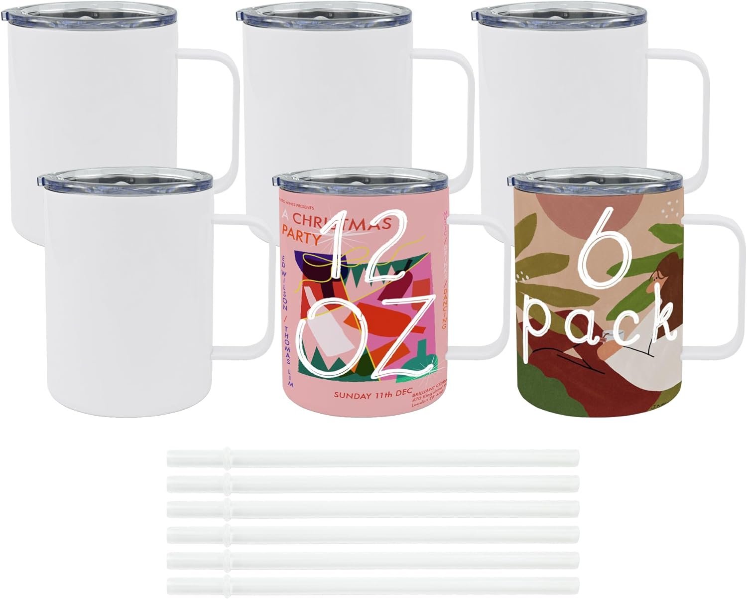 6 Pack 12 oz Sublimation Tumblers with handle Coffee Blanks, with Lid and Straw Cups Blank Bulk, Straight Skinny Insulated Cup Stainless Steel Water Bottle for Craft DIY…