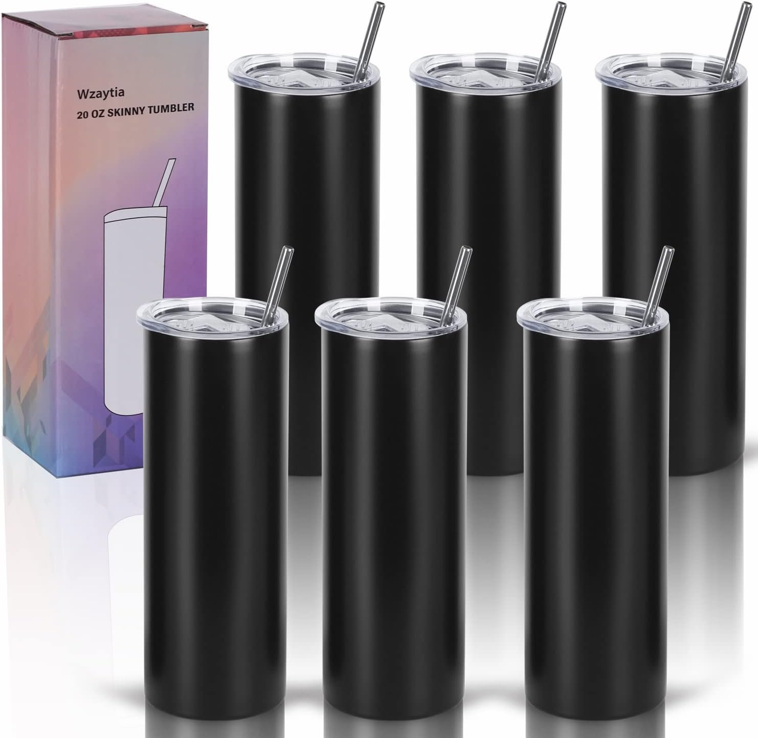 6 Pack 20 Oz Straight Skinny Tumblers,Individually Gift Boxed Stainless Steel Slim Skinny Tumbler Set Bulk, 20 Oz Insulated Slim Thin Travel Tumbler Cup for Diy, Black