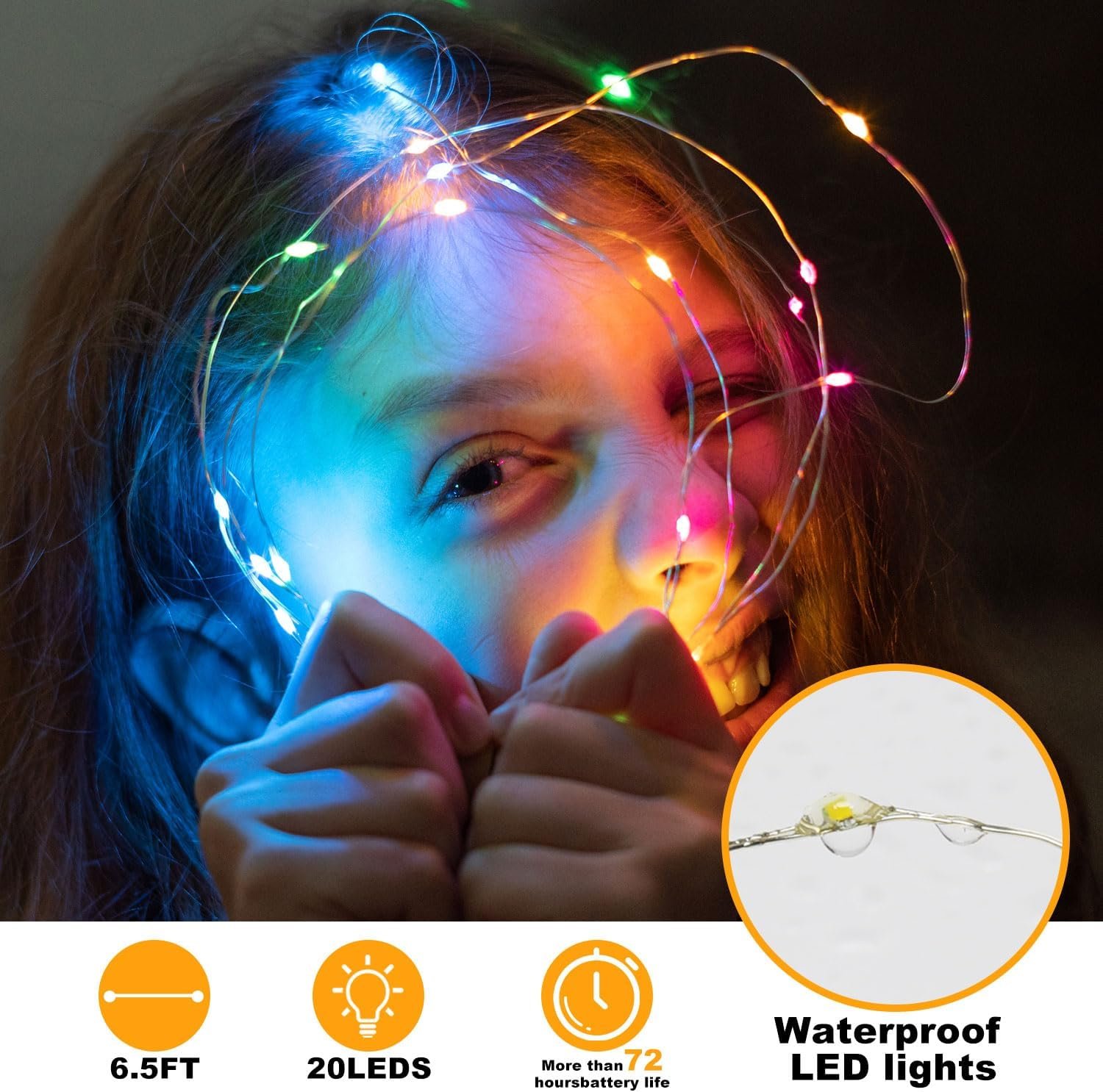 【 Flexible Silver Wire】This fairy lights battery operated have 7 ft of sturdy silver wire, silver wire can be easily bent, you can assemble the fairy lights arbitrarily and wrap them around the place you want to decorate, the silver wire of the led fairy lights has IP65 waterproof.