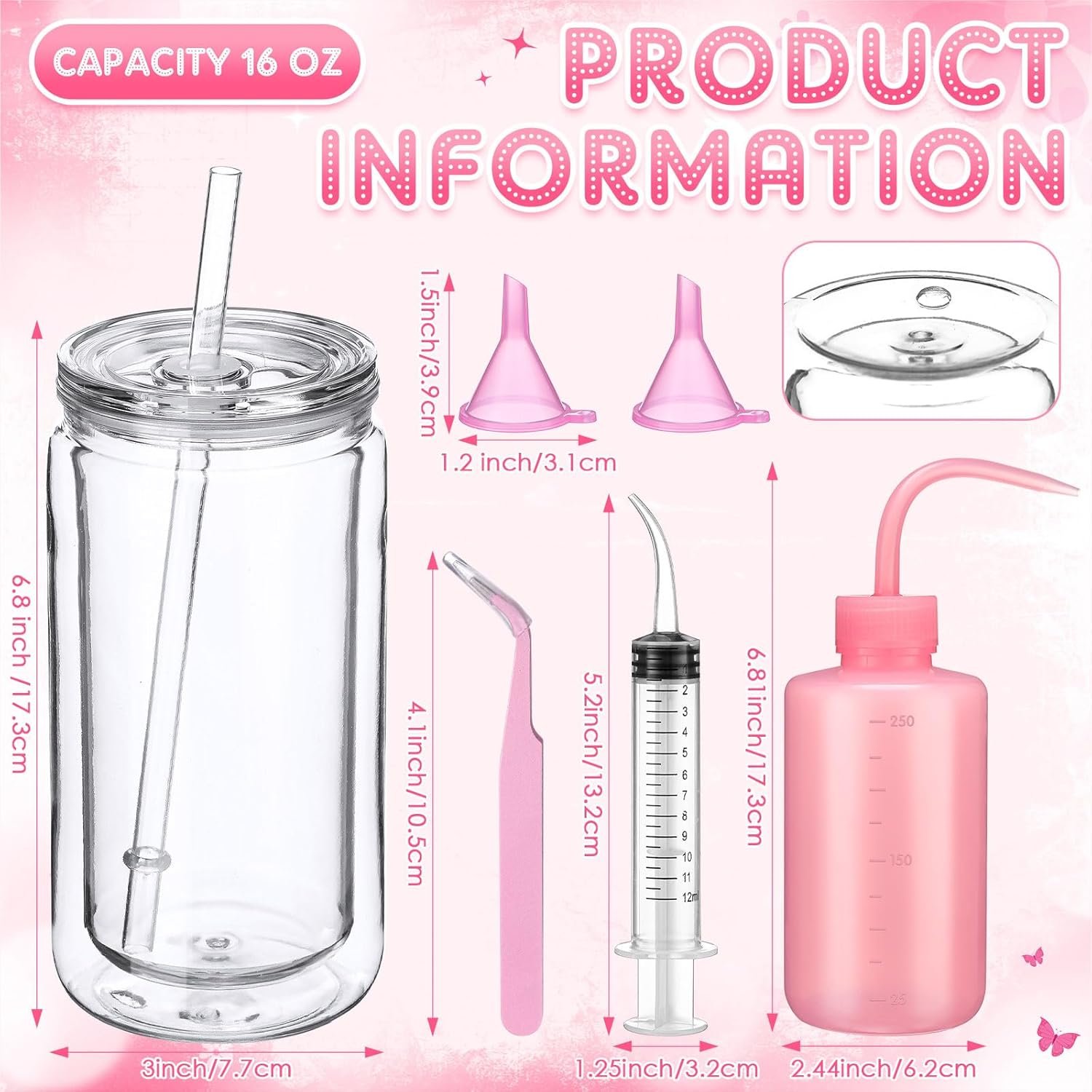 Ideal Size: the clear snow globe cup is 6 x 3 inches/ 15.3 x 7.7 cm; The inside capacity is 12oz and the outside capacity is 16oz; The straw is 7.5 inch/ 19 cm; The bottom hole is 0.4 inch/ 1cm in diameter; The curved spray can is 2.44 x 6.81 inch/ 6.2 x 17.3cm; The funnel is 1.2 x 1.5 inch/ 3.1 x 3.9 cm; The curved syringe is 0.4058 oz/ 12 ml; The curved tweezer is 4.1 inch / 10.5cm; This snowglobe cup DIY set is very convenient to make at home with your family or take out