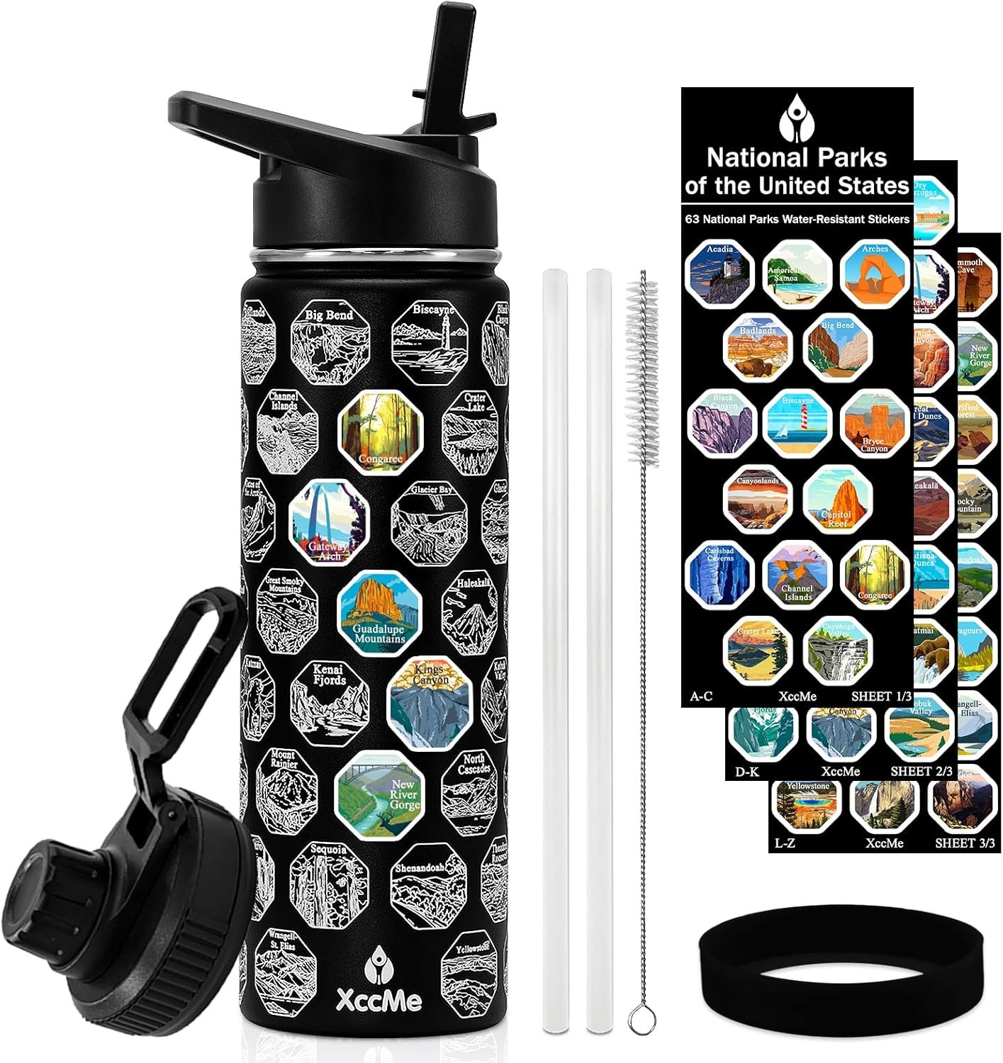 Includes 22oz insulated bottle,63 national park stickers*2,straw lid,spout lide,straw*2,straw cleaner*1,silicone boot*1