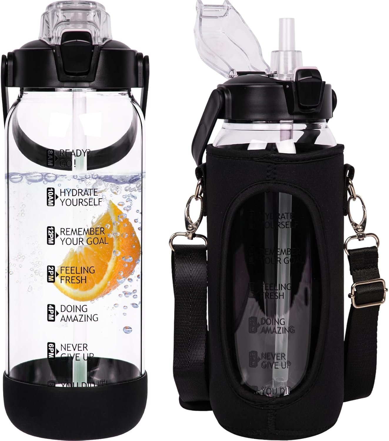 64 oz Glass Water Bottle with Straw and Time Marker, Half Gallon Large Motivational Borosilicate Glass Drinking Bottle with Silicone Boot and Sleeve