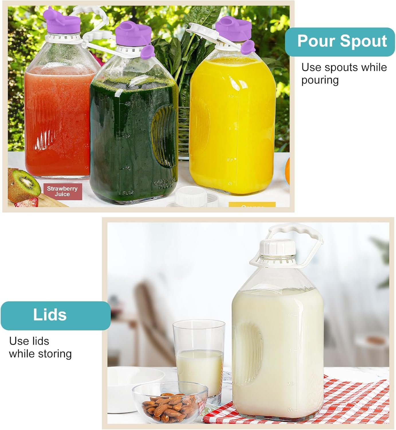 [Leak-proof & Reusable Airtight Strong SCREW Cap] – The glass juice bottle reusable lid is consist of a reusable cap and a removable silicone gasket which provide a airtight seal and watertight. Food-grade and reusable, great for ice water, ice tea, milk, juice, beverage, drinks, refrigerator safe