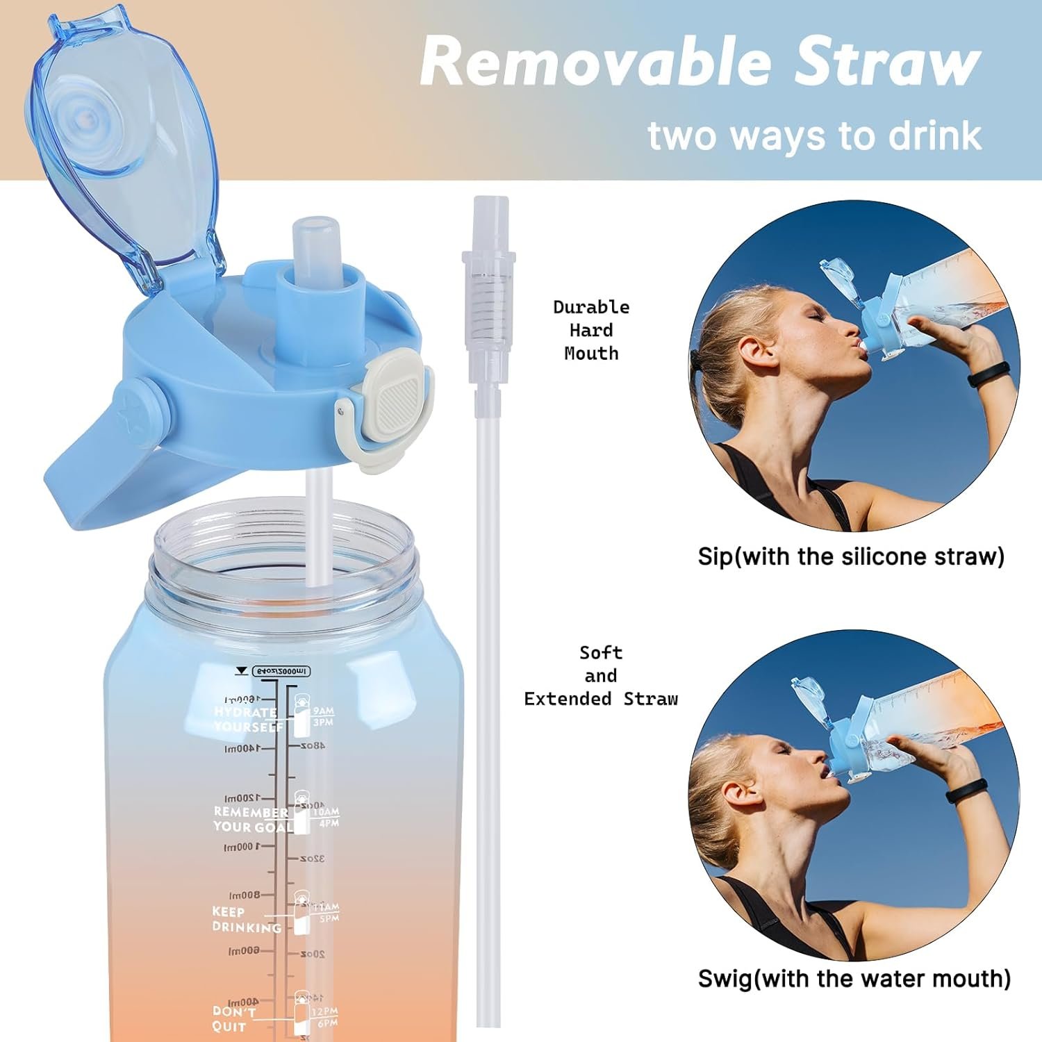 64oz Sports Water Bottle with Fruit Infuser, 2 in 1 Straw and Chug Motivational Water Bottle with Time Marker, Half Gallon Large Water Jug with Handle for Travel Fitness Gym Outdoor (Blue)