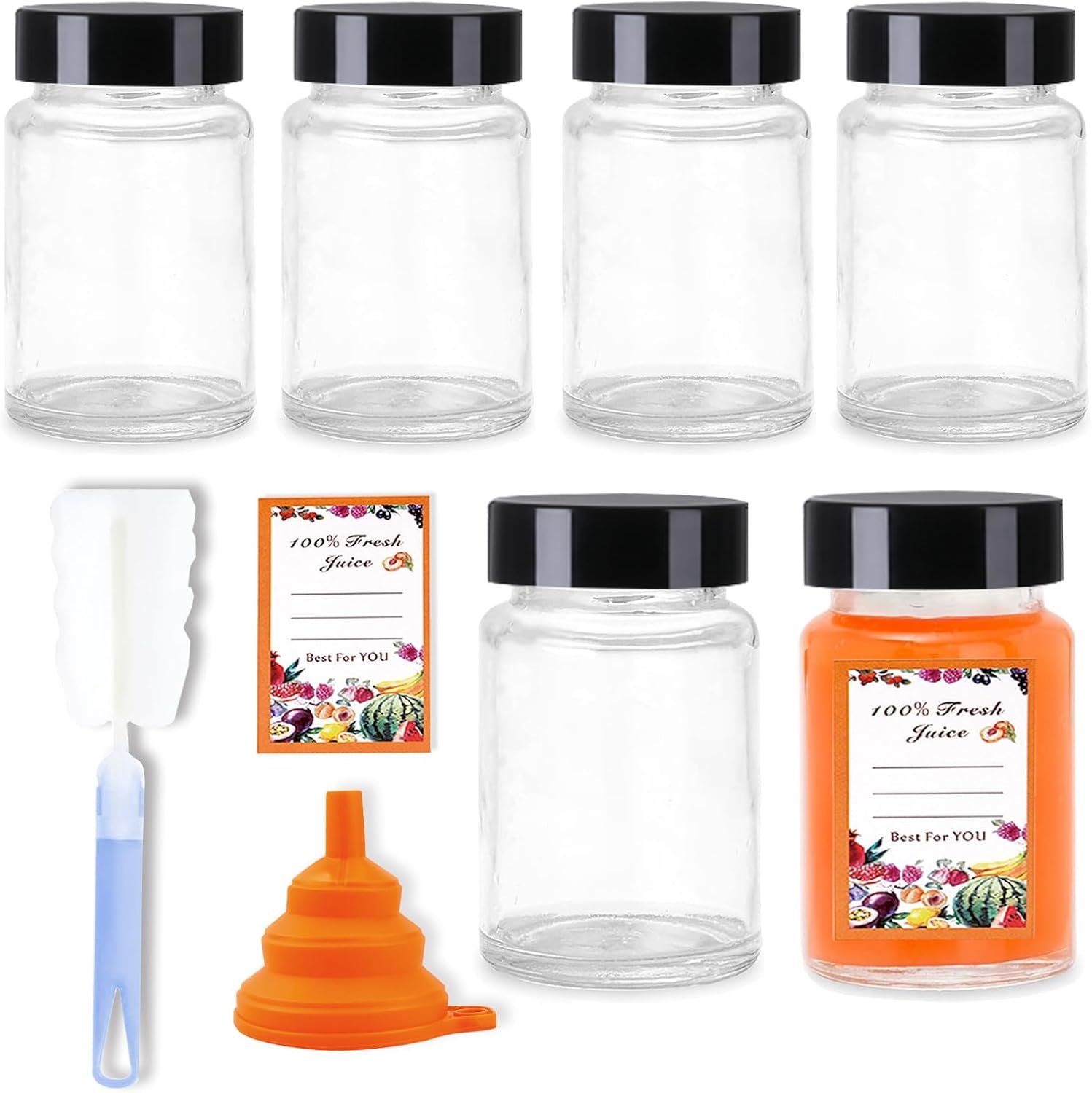 6Pack 2oz Glass Shot Bottles with Caps,Juicing Bottles Reusable,Ginger Shot Glasses Containers for Liquids,Sample,Wellness Shot,Turmeric,Juice,DIY,with Funnels,Stickers,Wide Mouth,Leakproof