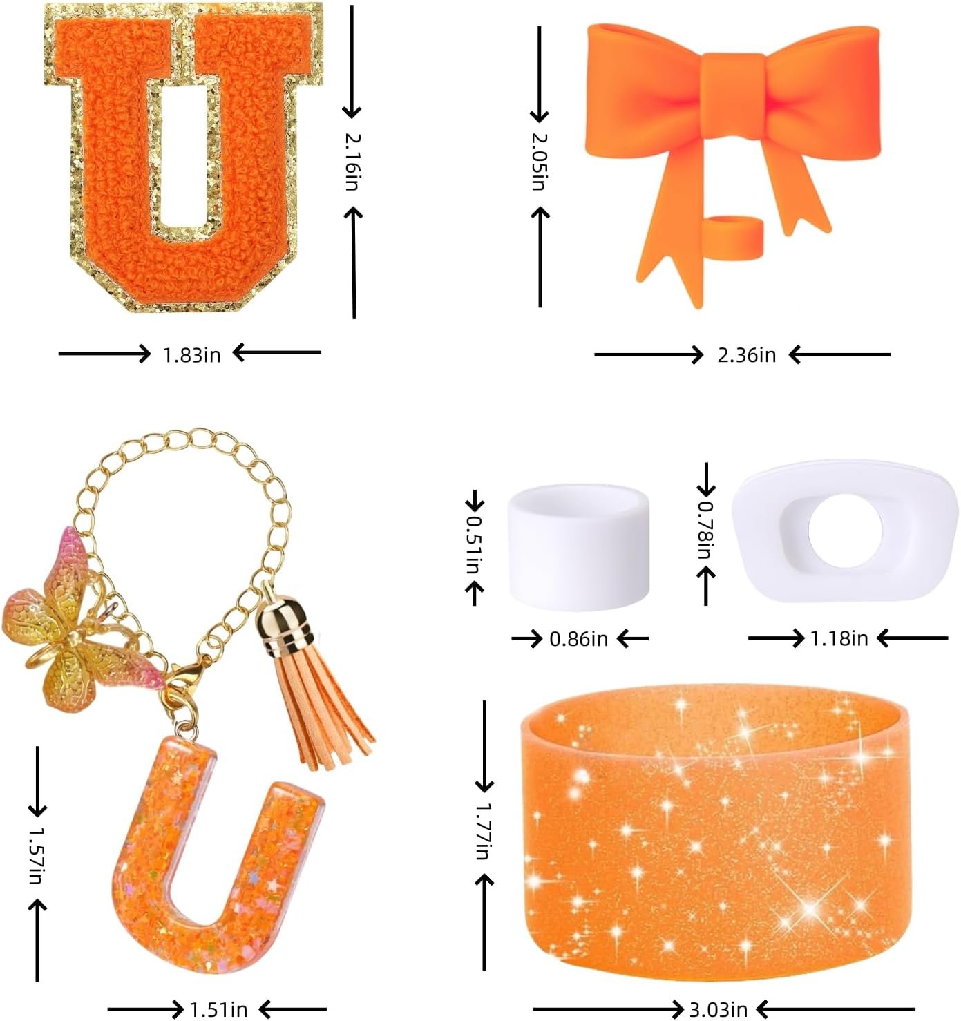 6PCS Orange Stanley Cup Accessories Set Fit for Stanley Cup 30oz 40oz,Including Spill Proof Stopper,Sparkly Silicone Boot,Bow Shape Straw Topper,Personalized Sticker,Handle Charm (Letter U)